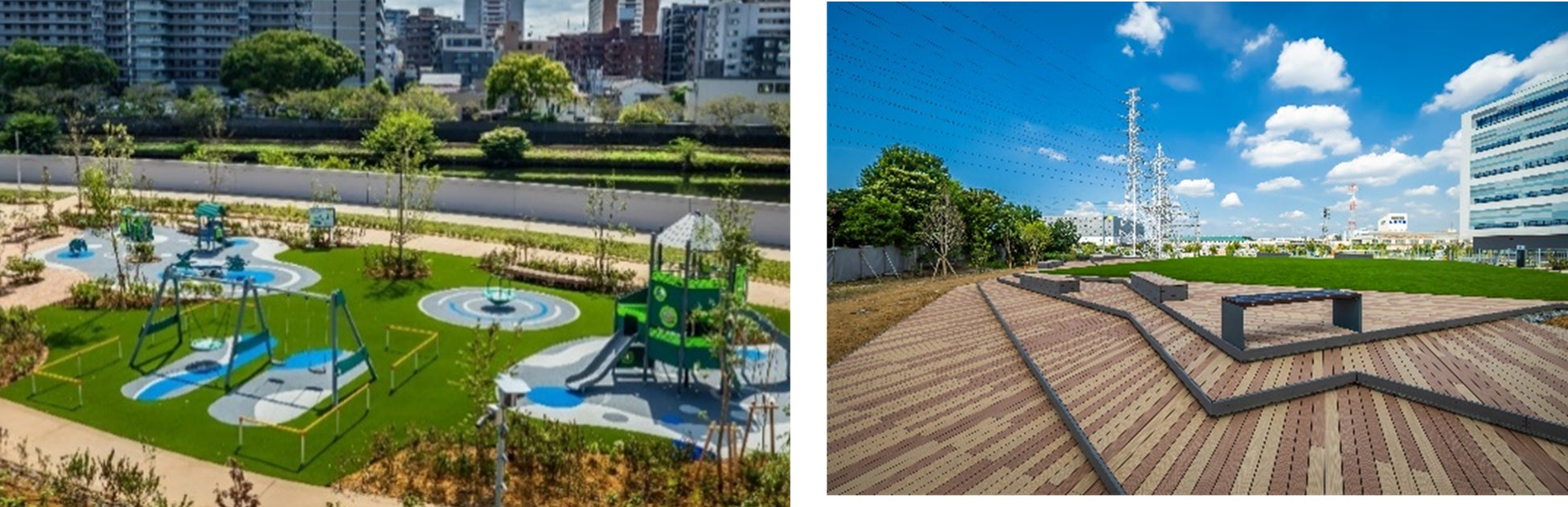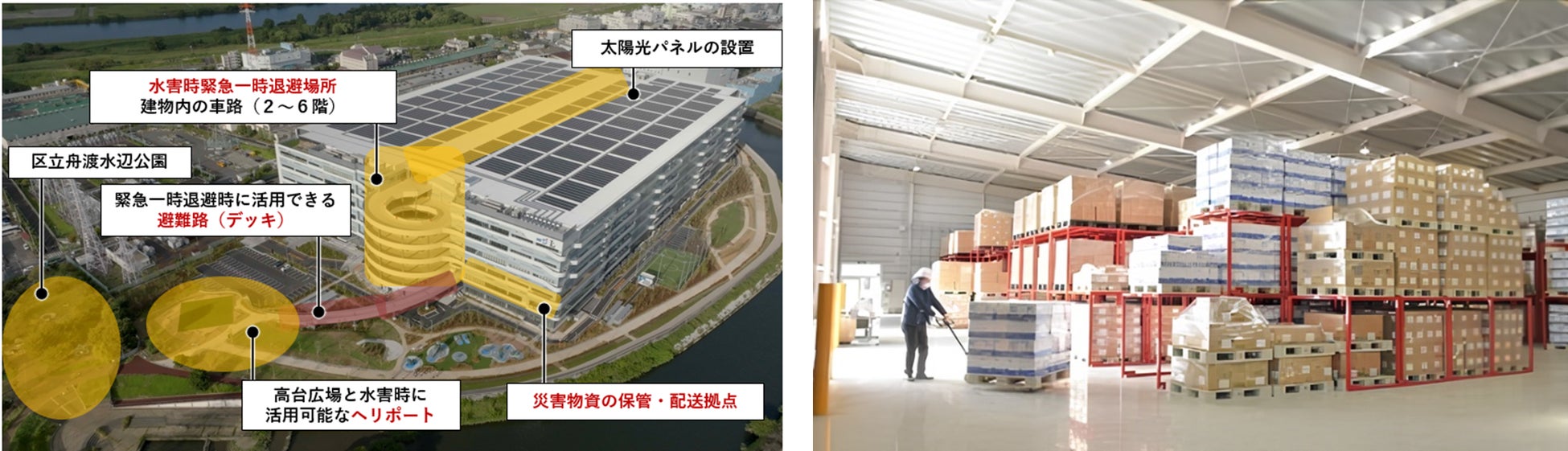 本施設は板橋区とともに、河川氾濫等の水害に強い安心・安全なまちを実現するため、国内で初めて、官民連携による高台まちづくりを実施しています。緊急着陸用のヘリポートとしても活用可能な高台広場と、隣接する板橋区立舟渡水辺公園を一体的に整備したほか、地域住民約1,000人を収容可能な緊急一時退避場所を整備。敷地内には、「板橋区災害時配送ステーション」を設置し、災害時に必要な飲料水や非常食等を保管するとともに、区内の避難所に支援物資を配送します。