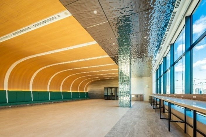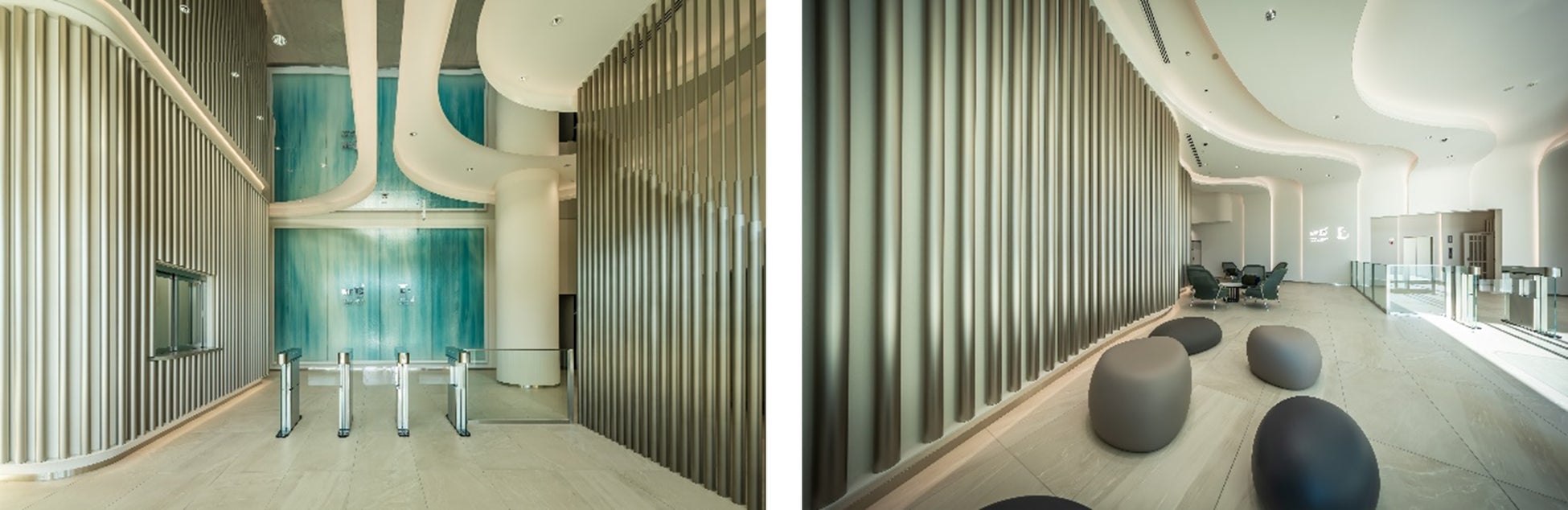 外装ファサードデザインとの共鳴とともに、スピーディーな物の流れと隣接する新河岸川の大らかな流れを表現。また、日本製鉄の鋼管パイプをモチーフとし、歴史の継承もデザインコンセプトとしました。