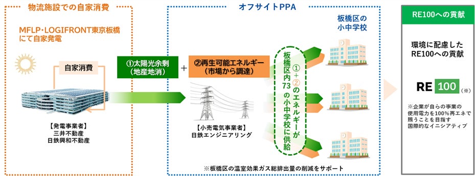 本施設では、屋上全面に約19,000㎡、約4MWの太陽光パネルを設置し、再生可能エネルギーを自家発電によって創出することで、電力の地産地消を実現します。さらに、太陽光の余剰電力をニーズに応じて板橋区内における73の区立小中学校へ供給することで、区立小中学校のRE100化にも貢献します。物流施設に設置された太陽光発電設備から、余剰電力を自治体施設へ供給(オフサイトPPA)する、先進的な取り組みです。