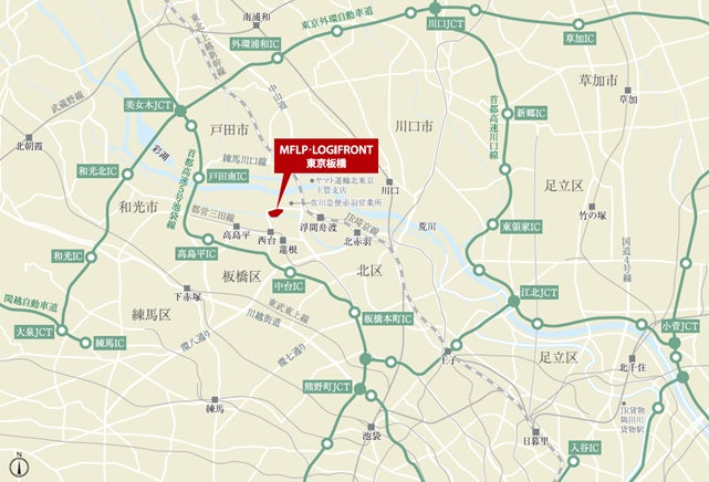 本施設は、都営三田線「西台」駅から徒歩10分と、交通環境に恵まれるとともに、周辺5km圏内には約106万人が居住するエリアに位置し、雇用確保においても有利です。また、最寄りの首都高速5号池袋線「中台」ICまでは約2.7kmと都心部への配送にも非常に適しています。さらに、都心部への配送のみならず、首都圏北部地域を網羅できる広域配送拠点となり、拠点集約による運送費の削減や配送リードタイムの短縮などにも寄与します。