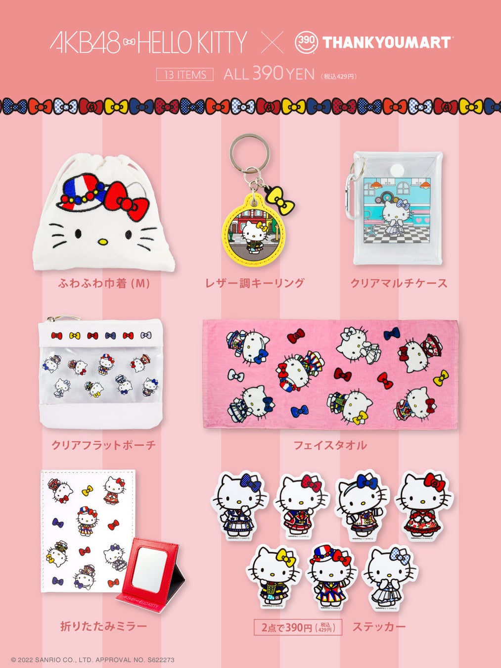 カワイイが集まる店内全品390円(税込429円)のショップ「サンキューマート」を運営するエルソニック株式会社は、アイドルグループ『AKB48』の15周年を記念してデザインされた株式会社サンリオのキャラクター『ハローキティ』デザインの限定アイテムを3月中旬より入荷順次販売開始いたします。ミリオンセラーを記録したAKB48の楽曲、「恋するフォーチュンクッキー」や大ヒット曲「ヘビーローテーション」など、7曲の衣装を纏った特別なキティちゃんが、ポーチやステッカーなどの全13アイテムになって登場します。