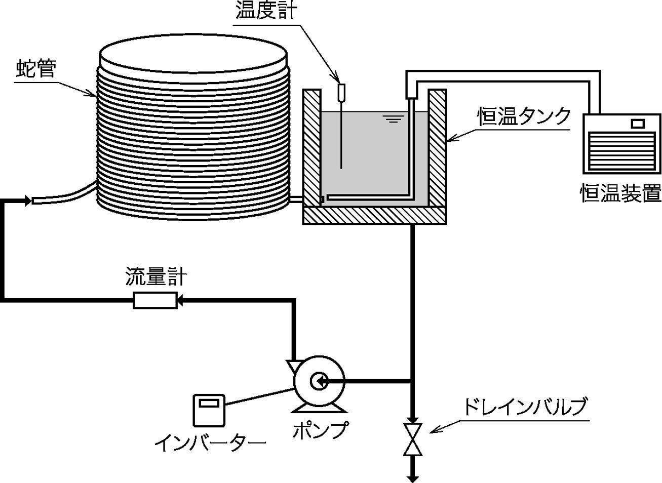 このJISでは、抵抗低減性能及び防せい性能(腐食速度)の試験方法を規定しています。ポンプのモータ回転数をインバータで制御しながら、一定温度の水を循環させ、水だけの場合と抵抗低減剤を添加した場合の流量差を求め、これを水だけの流量で割ったものを抵抗低減率として評価する方法です。図2に抵抗低減性能試験の測定装置の構成例を示します。これによって、セントラル空調システムに用いられる抵抗低減剤の性能を客観的に示すことが可能となり、信頼性の向上や製品の差別化につながり、新しい市場の創出及びその普及が期待されます。さらに、抵抗低減剤が普及することによって、電力使用量やCO₂排出量などの削減とともに、環境保全の推進及びSDGsへの貢献に資することが期待されます。