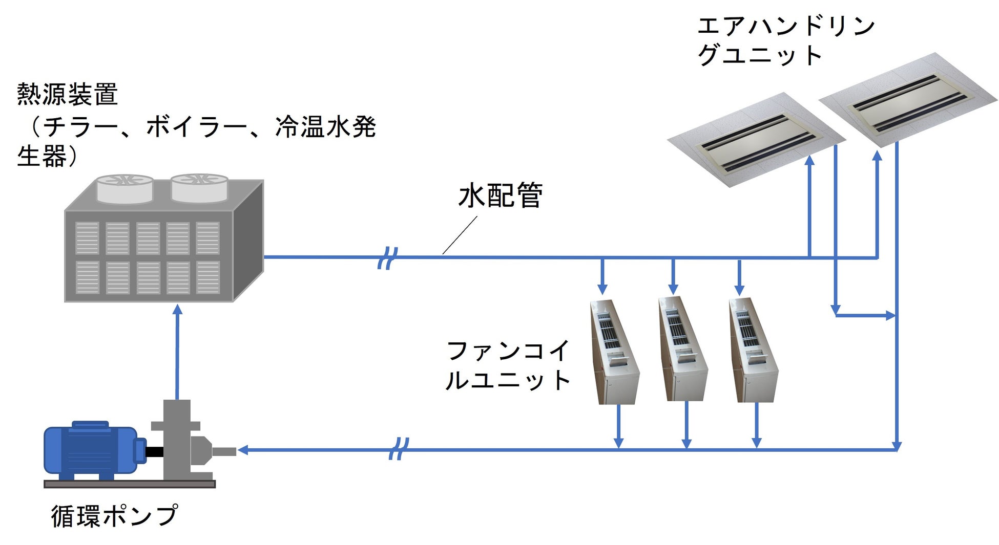 オフィスビルや商業施設などで使われるセントラル空調システム(図1参照)は、一つの熱源(ボイラーや冷凍機など)で生成した温水や冷水を、配管を通じて建物内の各所に設置された小型の空調機などに供給し、空調を行う方式です。