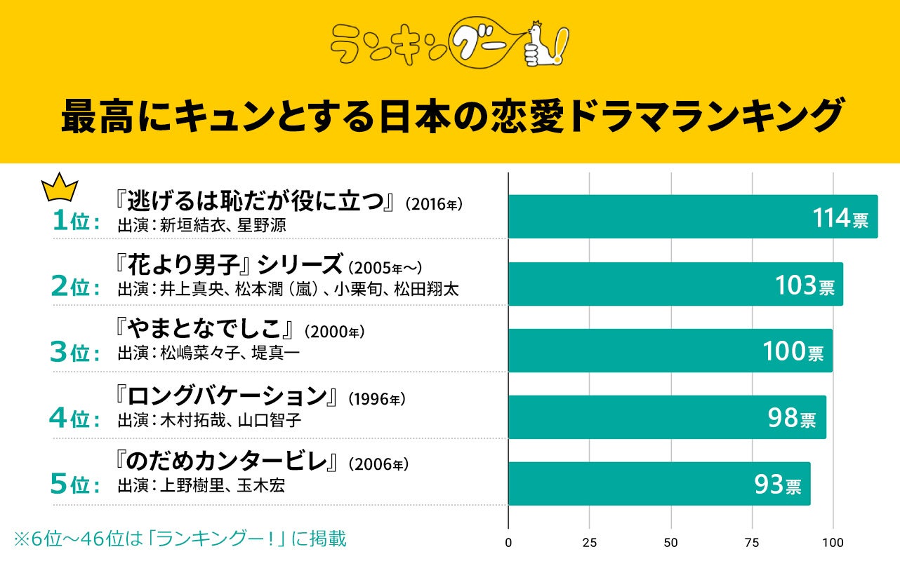 ランキングー!では最高にキュンとする日本の恋愛ドラマをピックアップし、ランキングを調査。10~40代の男女(性別回答しないを含む)2,715名にアンケートを行い、同率票を含むTOP46を決定しました。ここではTOP5をご紹介します。