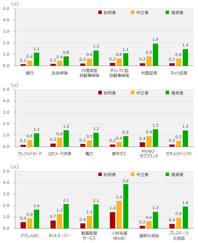 1.全18業界すべてにおいて推奨者は中立者や批判者に比べてポジティブな口コミを伝えた人数が多い。特にネットスーパー、動画配信サービス、人材派遣(BtoB)では1年間に平均2人以上に口コミを発信。