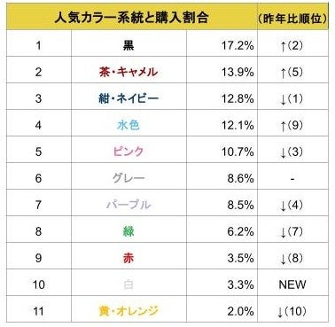 人気1位は黒。男女ともに人気の茶・キャメルが上位に。大幅ランクアップの水色とともに、淡い色合いも主流に。