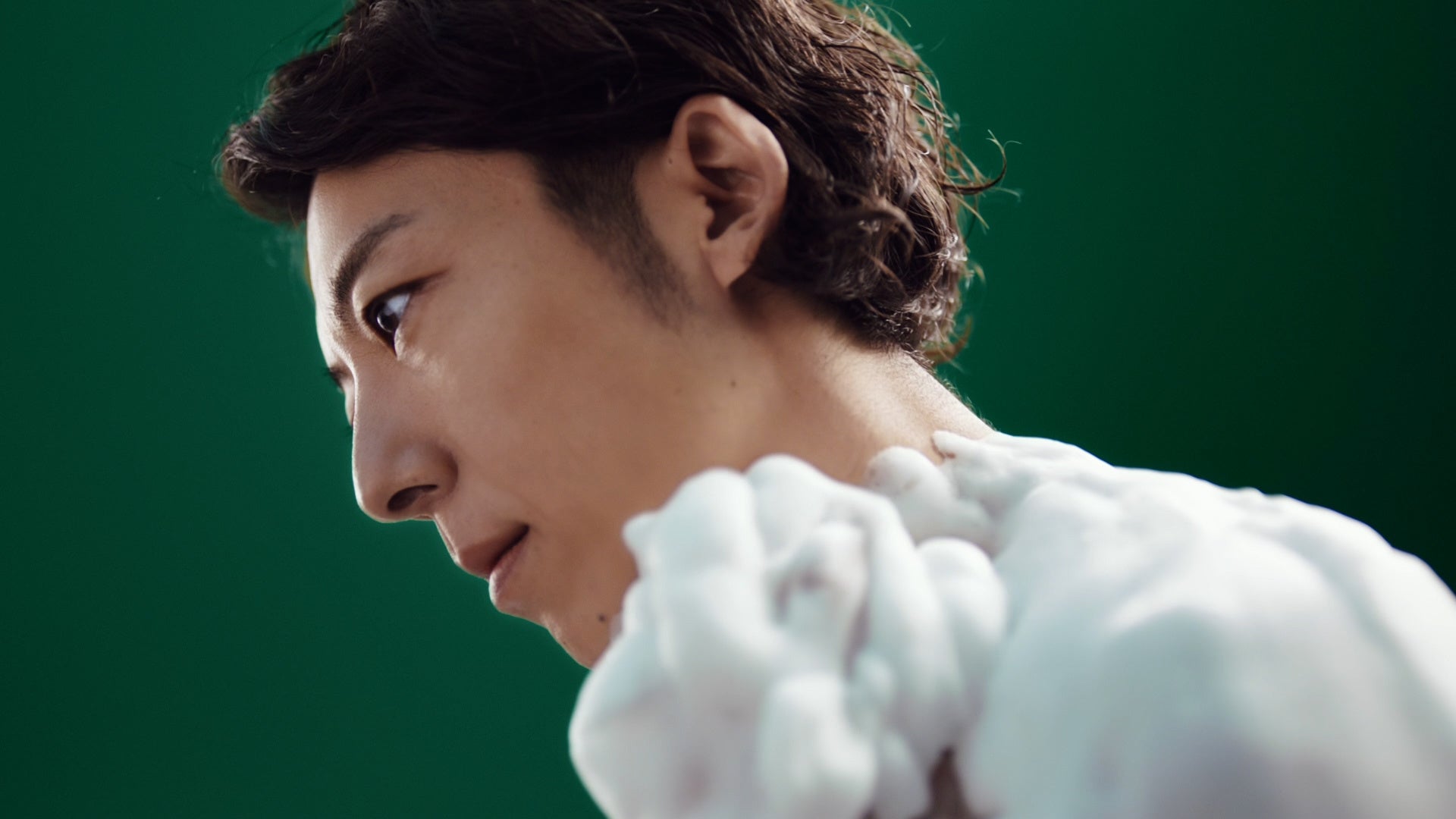 「ナイーブ」のブランドカラーであるグリーンの世界の中で、高橋一生さんはグラフィック撮影に臨んでいます。撮影が順調に進む中、高橋さんは「The Naive」の泡に驚きます。