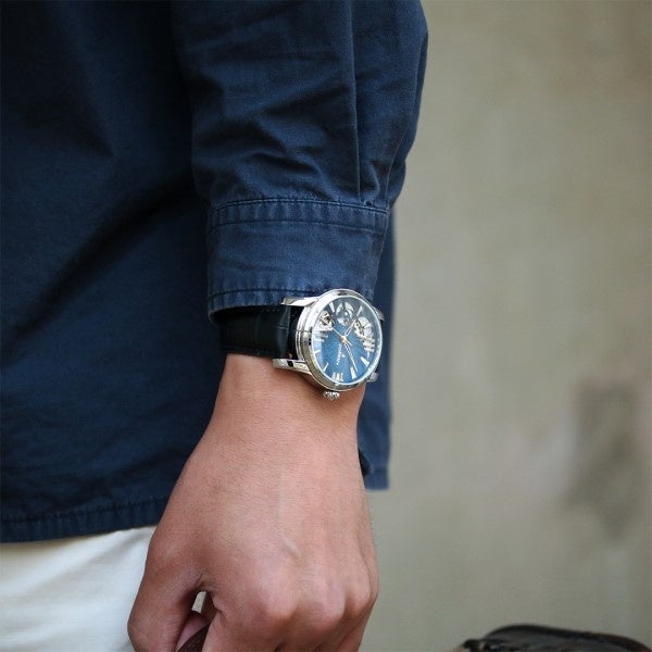復活を記念したチックタック別注モデルを限定30本ご用意。波模様が施されたメタリックブルーのサンレイ文字盤は、高級感と洗練された印象を与え、ゴールドの針が更なる高級感と視認性をアップさせています。また、ネイビーレザーのベルトにはネイビーステッチが施され、文字盤の色とマッチして統一感があり、型押しのクロコパターンが上品さを引き立てます。こちらのモデルは特別にメタルベルトも付属します。普段使いはもちろん、特別な日の装いにも最適です。