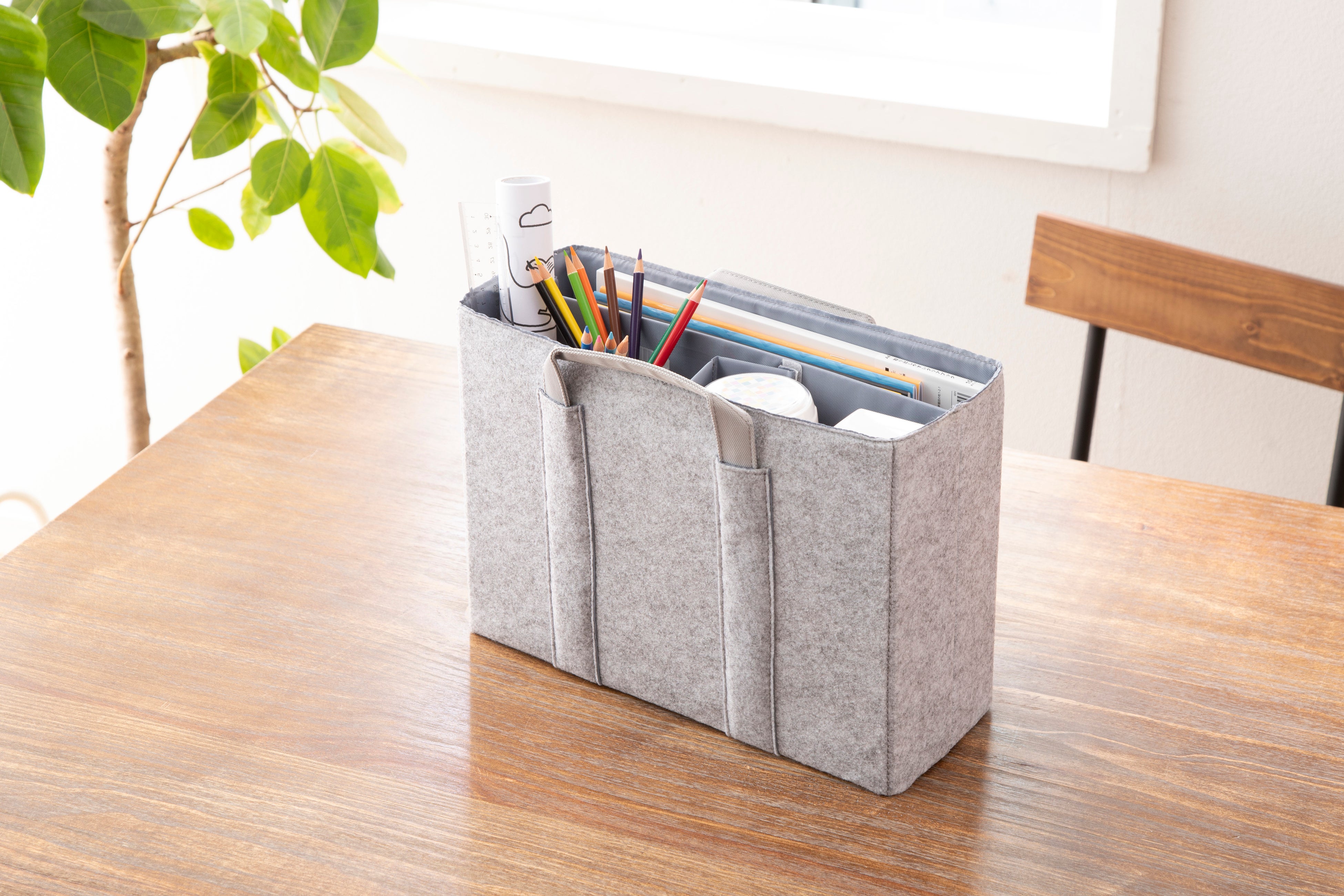 フリーアドレスのオフィスや在宅ワーク、自宅学習等の室内移動に適したバッグ。中身やシーンに合わせ、仕切りの形状が変更可能です。持ち手はコンパクトに格納できるため、ファイルボックスのようにロッカーや本棚等にそのまま収納が可能です。道具を取り出す・しまう・持ち運ぶ・保管するという、一連の動作での使いやすさにこだわりました。働き方や学習スタイルの変化に伴う使用シーンの拡大や、持ち物の多様化に合わせた自由度の高いデザインで、ストレスフリーな環境と気持ちが整います。