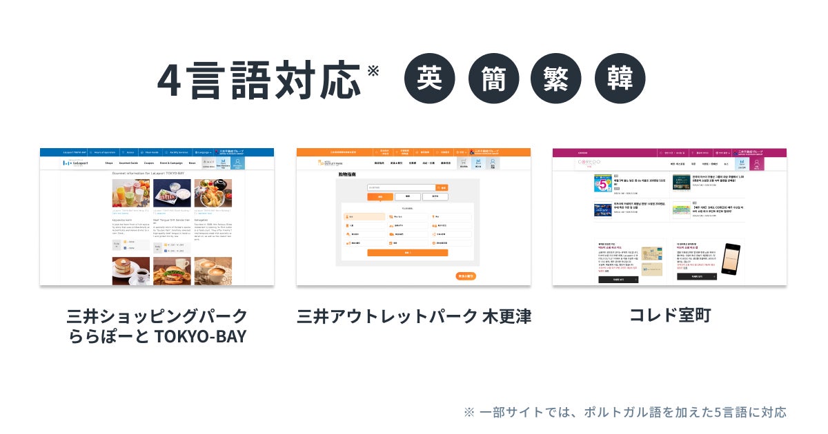三井不動産商業マネジメントが運営する、三井ショッピングパーク ららぽーとや三井アウトレットパークなど61施設のサイトを日本語から4言語*(英語、簡体字、繁体字、韓国語)に対応しています。
