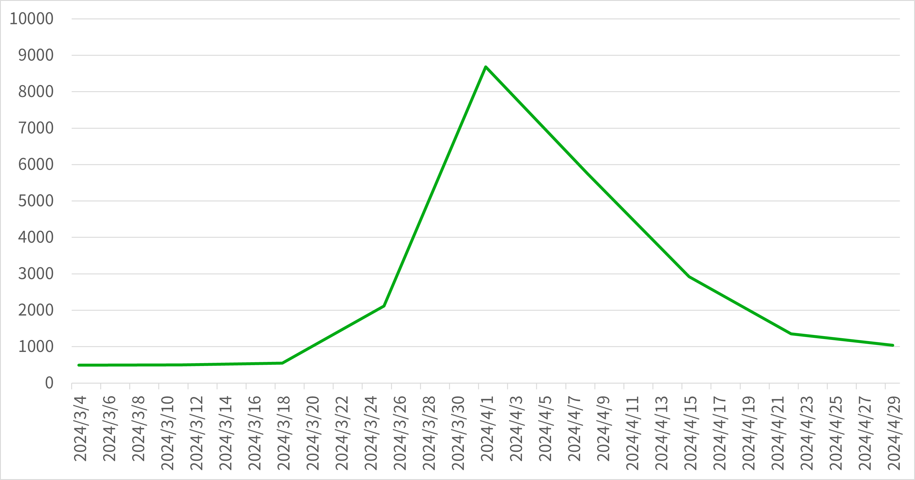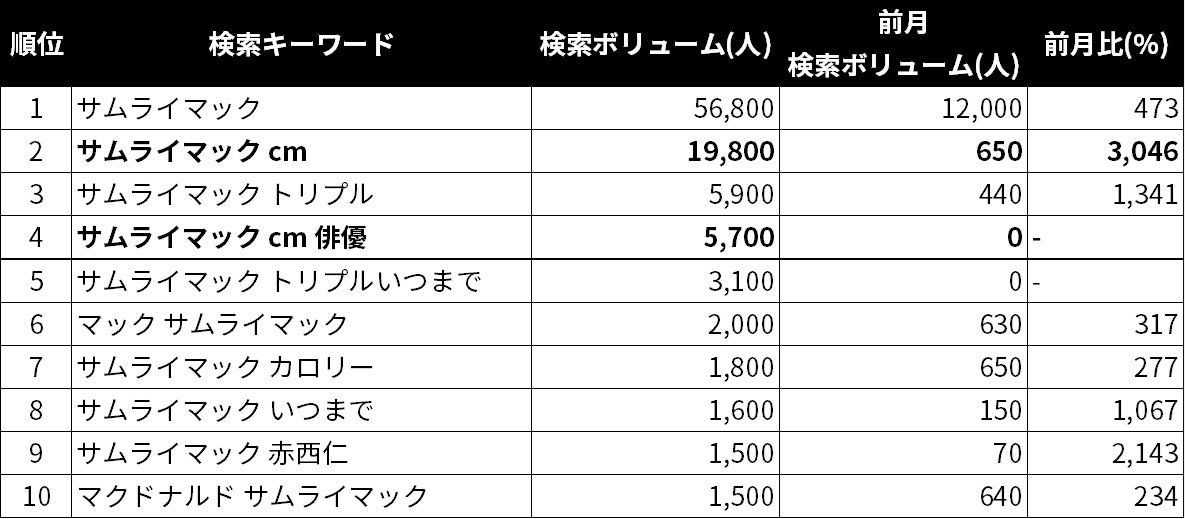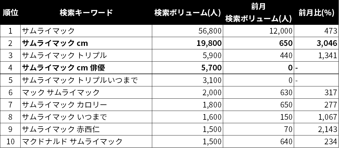 4月の共起キーワードを見てみると、サムライマック®関連のキーワードが前月と比べて上昇しており、「サムライマック」は4倍以上の数値になっています。商品名の他にも「サムライマック cm」「サムライマック cm 俳優」等、事前にXで告知をしたことも功を奏し、テレビCMに関連するようなキーワードの検索ボリュームが上昇しています。また、テレビCMに新たに誰が出演するのかを確認するためにCMを見た方々が期間限定で「炙り醤油風 トリプル肉厚ビーフ」が発売されていることにも気づき「サムライマック トリプル」などの期間限定メニューに関する検索ボリュームも急増しました。