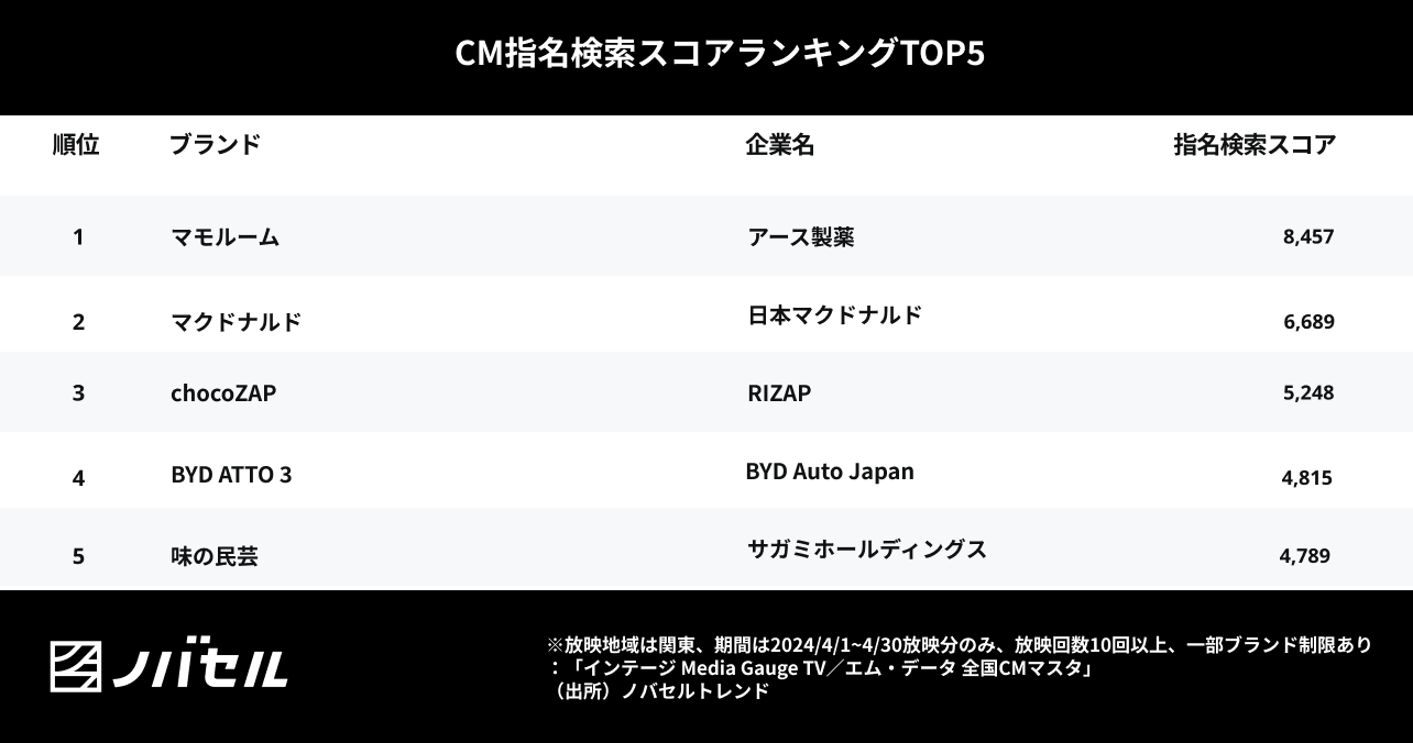 2024年4月1日~4月30日の期間に放送されたテレビCMのうち、高い指名検索スコアを獲得したCM上位5件のランキングと、CM内容をご紹介します。