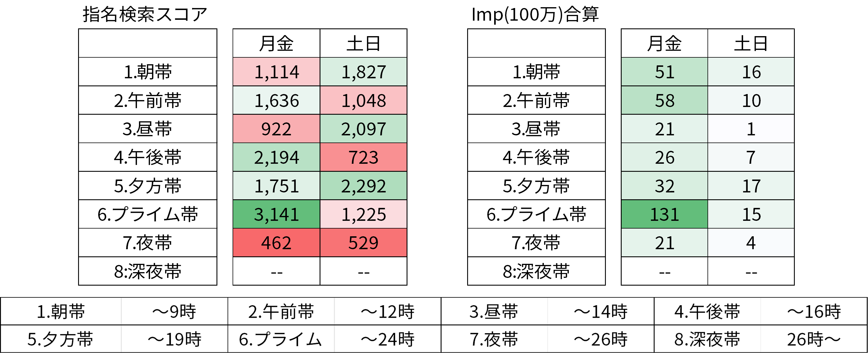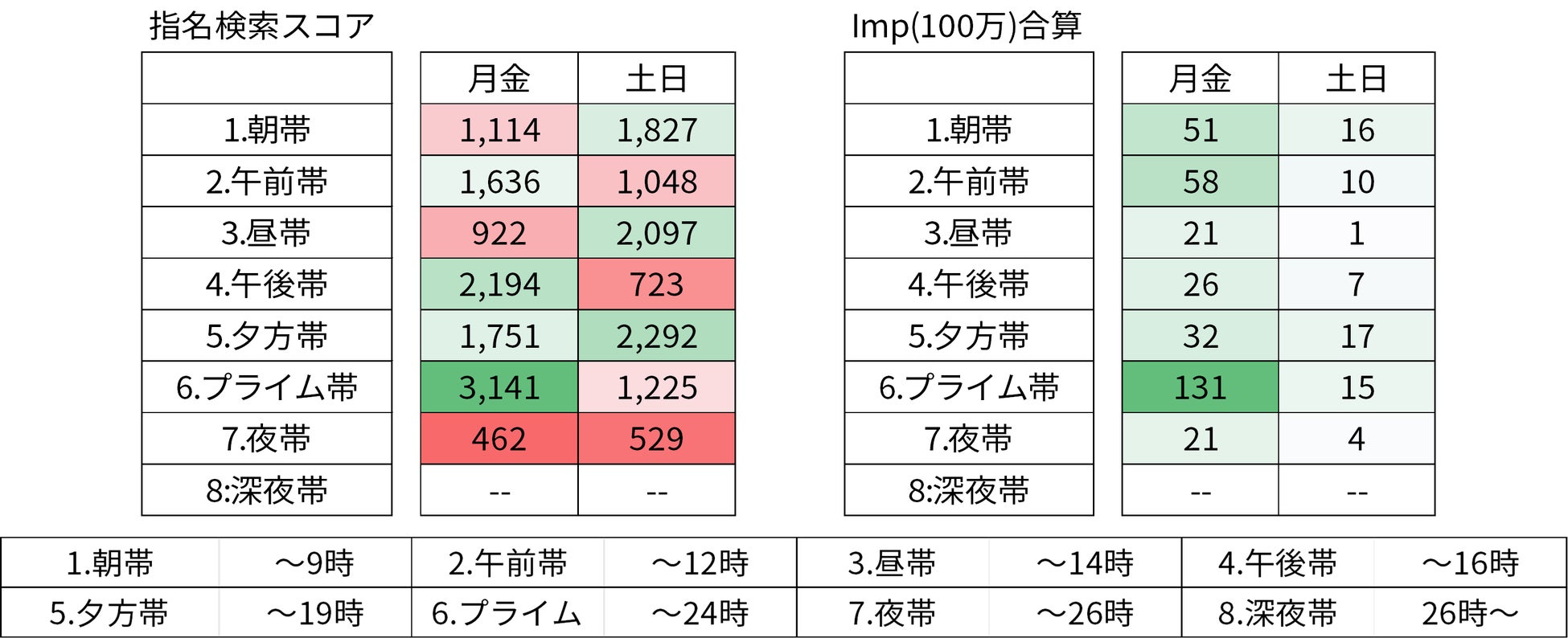 指名検索スコアは平日プライム帯が高くなっており、出稿の時間帯とターゲットが合っていると言えます。土日の指名検索スコアが高めになっているのは、テレビCMを見て実際に休日にマクドナルドを利用する方が多いのではと考えられます。