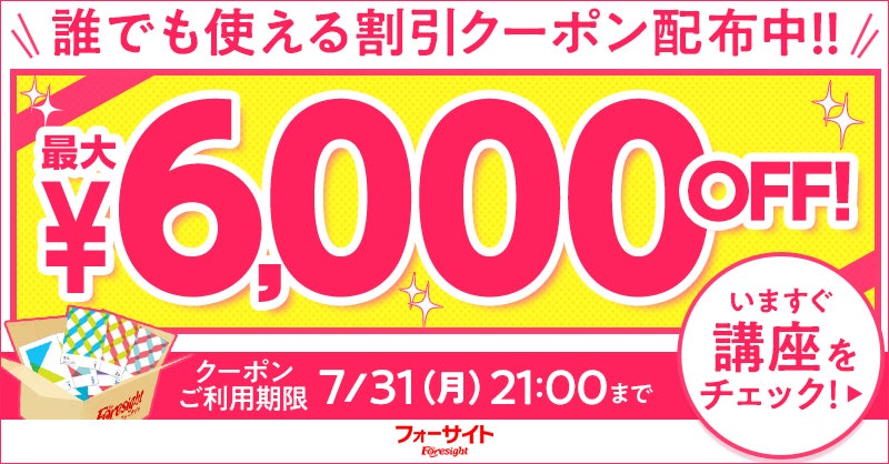 最大で6,000円割引のお得なクーポンは、7月31日(月)21時までに商品のお申し込みされた方が対象となります。