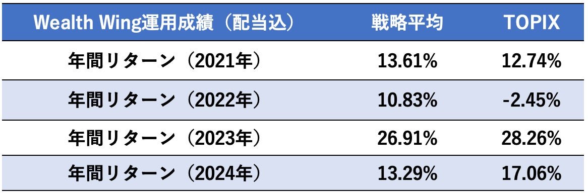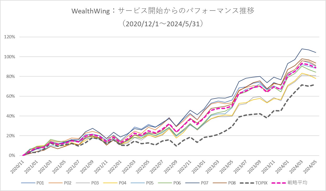 次世代金融インフラの提供を通して組込型金融を実現し、金融がもっと暮らしに寄り添う世の中を創るFinatextグループの証券会社、株式会社スマートプラス(本社:東京都千代田区、代表取締役:小林 紀子、以下「当社」)が提供する、日本株おまかせ投資サービス「Wealth Wing(ウェルスウイング)」にて、2024年5月の運用結果が最も良かった戦略は日本株市場(東証株価指数、以下「TOPIX(配当込み)」)を1.41%下回りました。