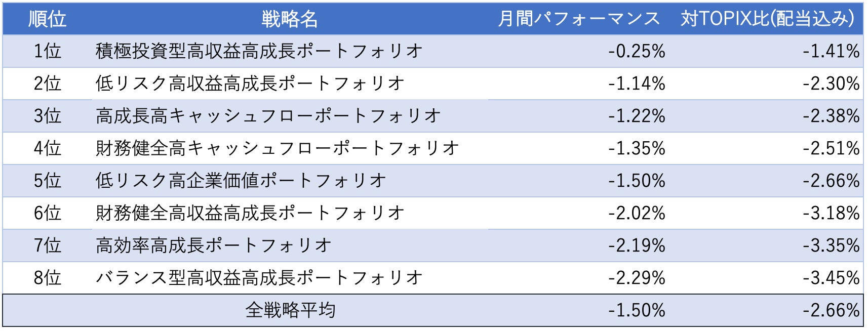 Wealth Wingがご提供する全8戦略の平均運用成績は、月間で-1.50%、対TOPIX比で-2.66%となりました。