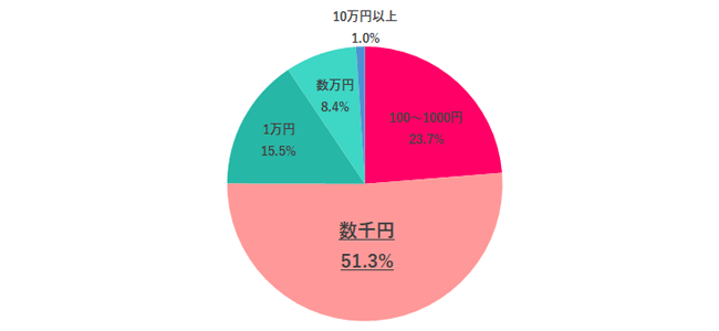 年間でどの程度宝くじを購入しているかを聞いてみると、最も多かったのは「数千円」51.3%で、次いで「100~1000円」23.7%、「1万円」15.5%となりました。「数万円」「10万円以上」と答えたのは1割以下でした。