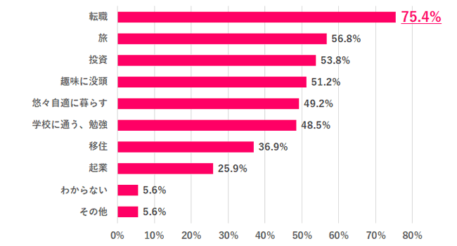 Q.3で「今の仕事を辞める」と答えた人に、辞めた後に何をするかを聞いてみたところ、1位「転職」75.4%、2位「旅」56.8%、3位「投資」53.8%となりました。その他のコメントでは「家を買う」や「介護や育児に専念」のほか「図書館への寄付」や「動物の保護施設を作る」などの回答もありました。