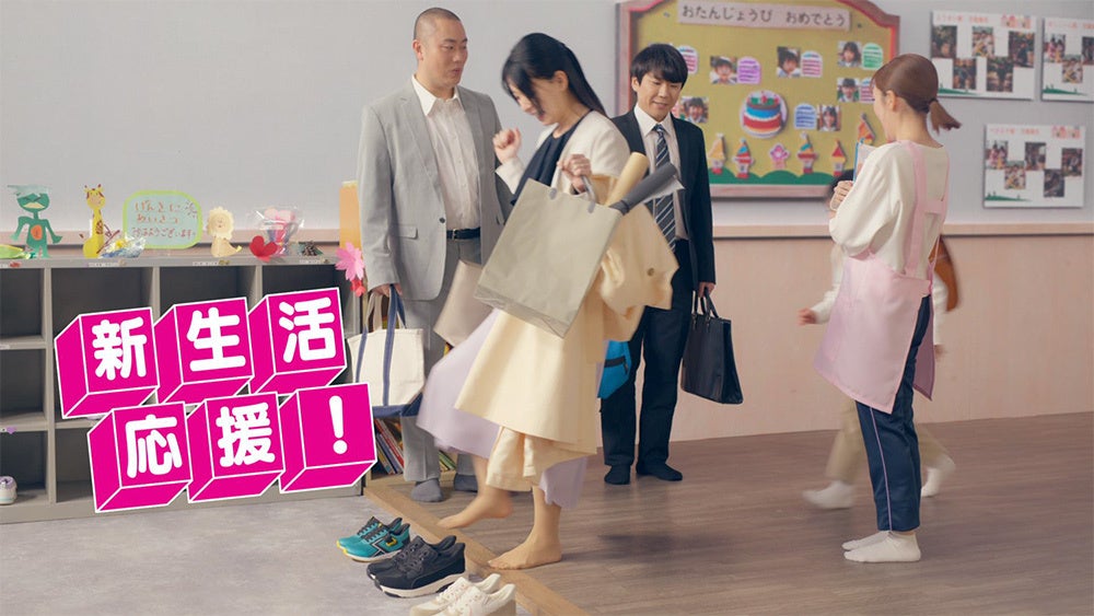 その新TVCM「こんな場面でスパット!朝のバタバタ」篇は朝の忙しい玄関先で、「こんな場面でスパット!保育園」篇は保育園の送り迎えの設定で、高橋さんとハナコさんの3人がコント仕立てで、手を使わずに立ったままスパッと履けるスパットシューズを楽しく紹介してくれています。