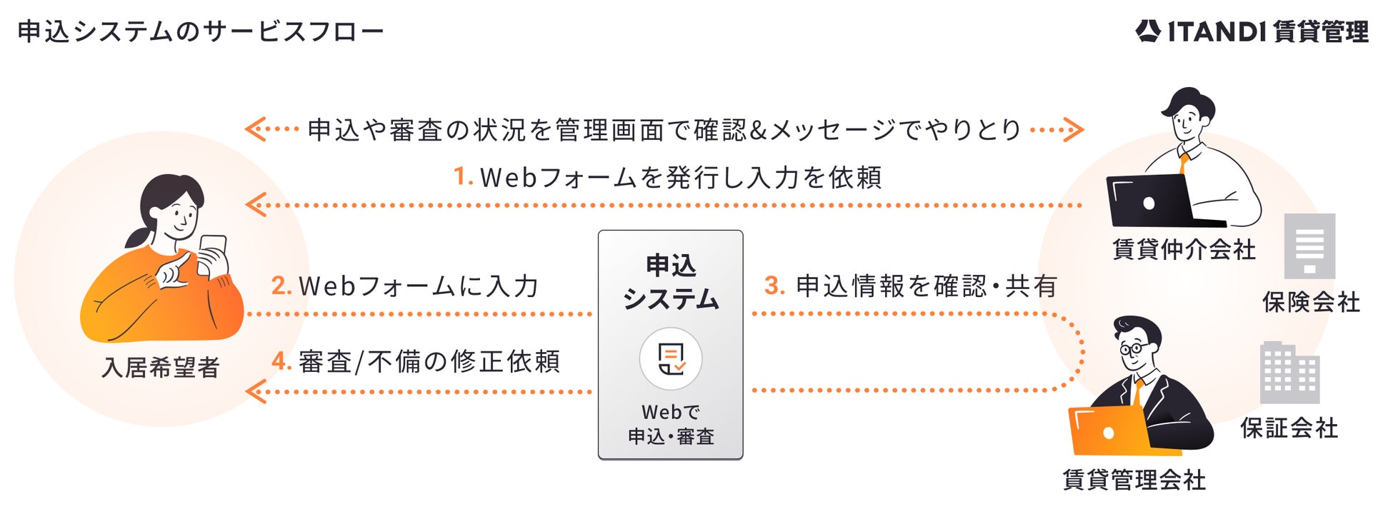 「ITANDI 賃貸管理」申込システムは、⼊居希望者がWeb上で⼊⼒した申込に必要な情報や申込⼿続きの進捗を、賃貸不動産管理会社、賃貸不動産仲介会社、家賃債務保証会社、保険会社などに連携し、申込書提出から審査までのやりとりを効率化することができる、賃貸住宅等の入居申込受付システムです。
