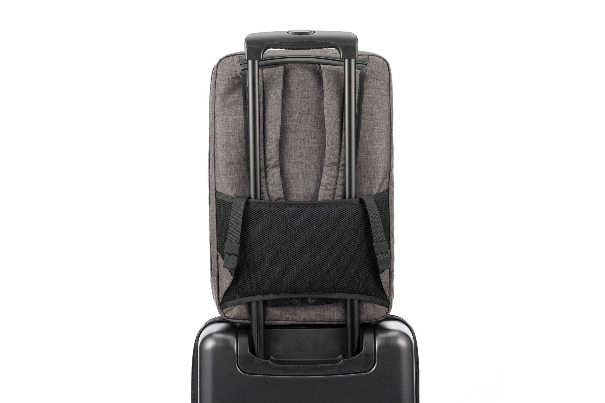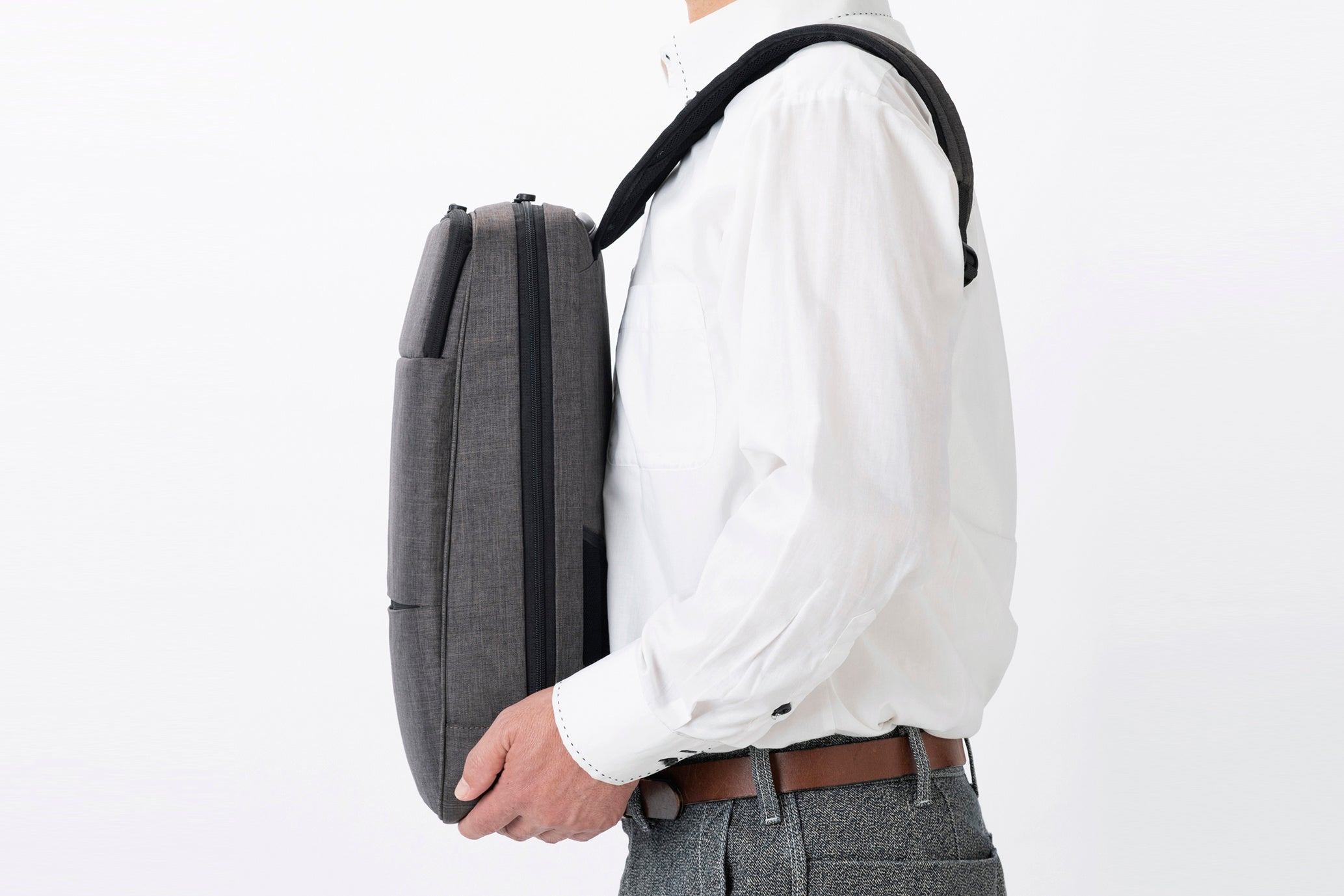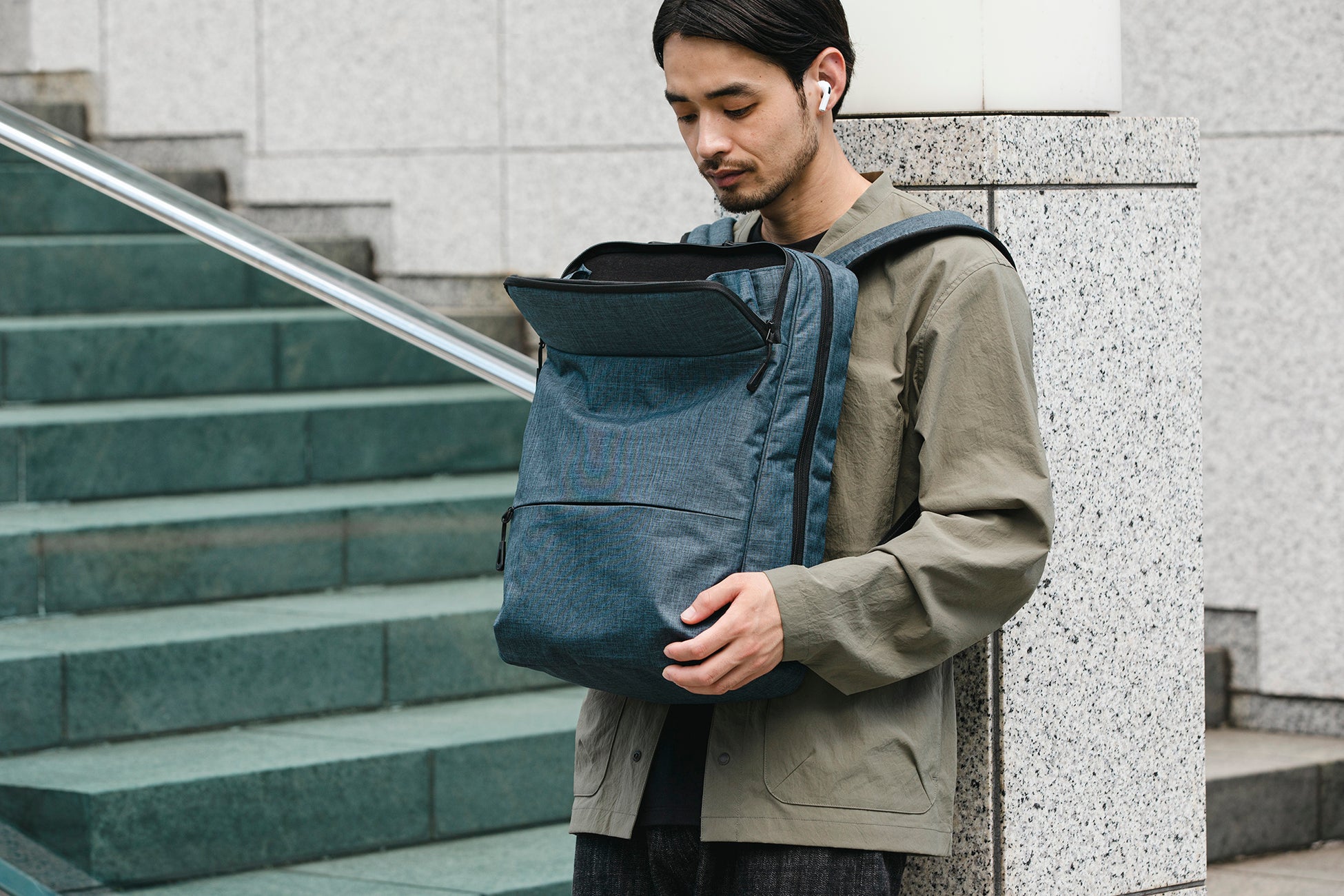 「フロンパック」は、交通機関でのマナー問題に端を発したリュックの前持ちスタイルに着想を得て開発されました。従来の概念を覆す<前に持つことを前提としたデザイン>となっています。リュックの前持ちは他者への気遣いだけでなく、荷物を取り出しやすく、盗難予防になり、傘からはみ出しにくいなど、ユーザーメリットが多い持ち方です。