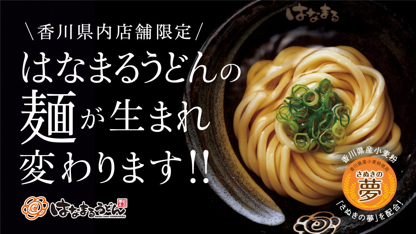 この度、「おいでまい!さぬきプロジェクト」活動の新たな取り組みとして、3月18日より、香川県内の「はなまるうどん」全14店舗にて、香川県産小麦粉「さぬきの夢」を配合したうどんの提供を開始いたします。