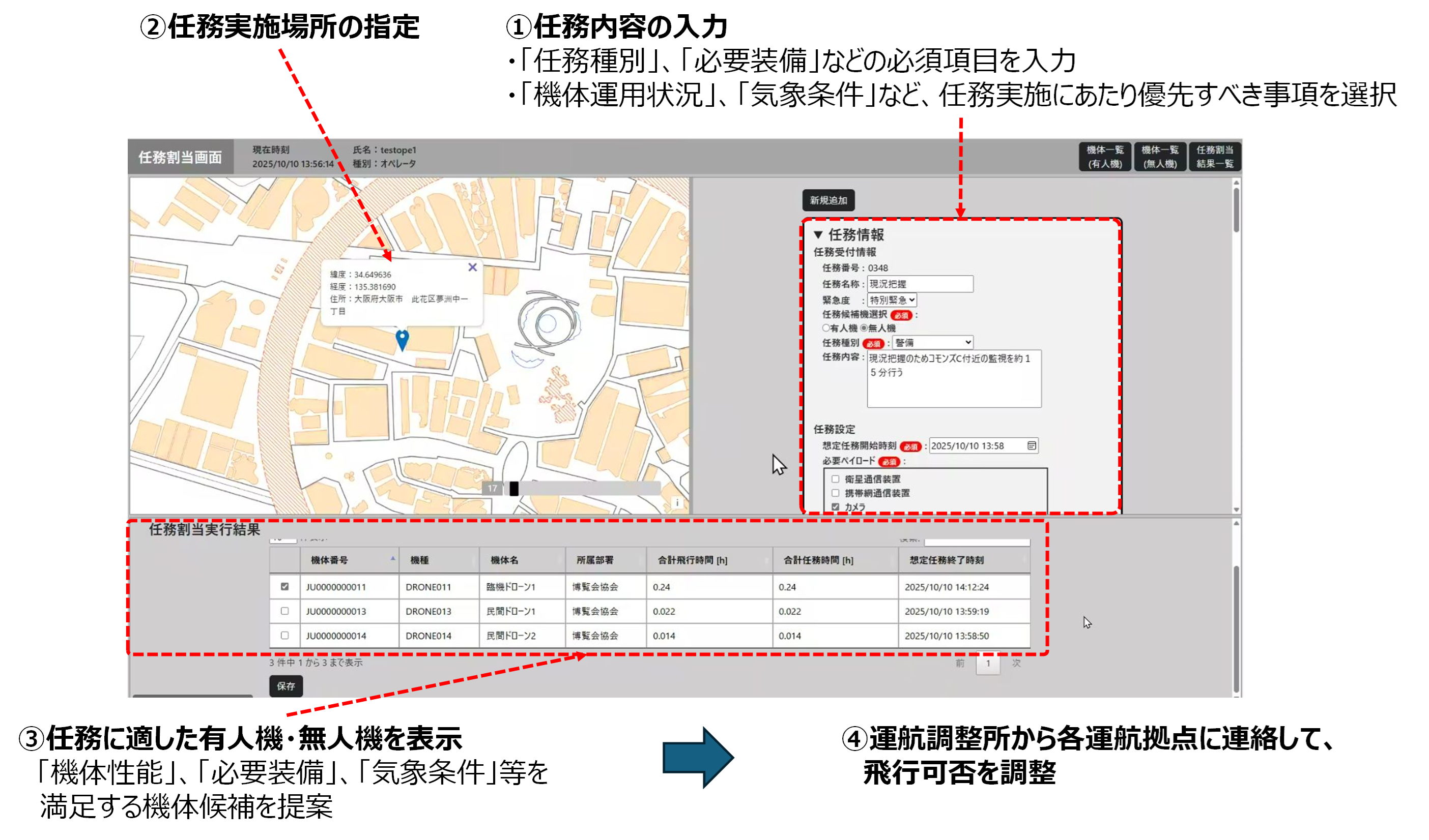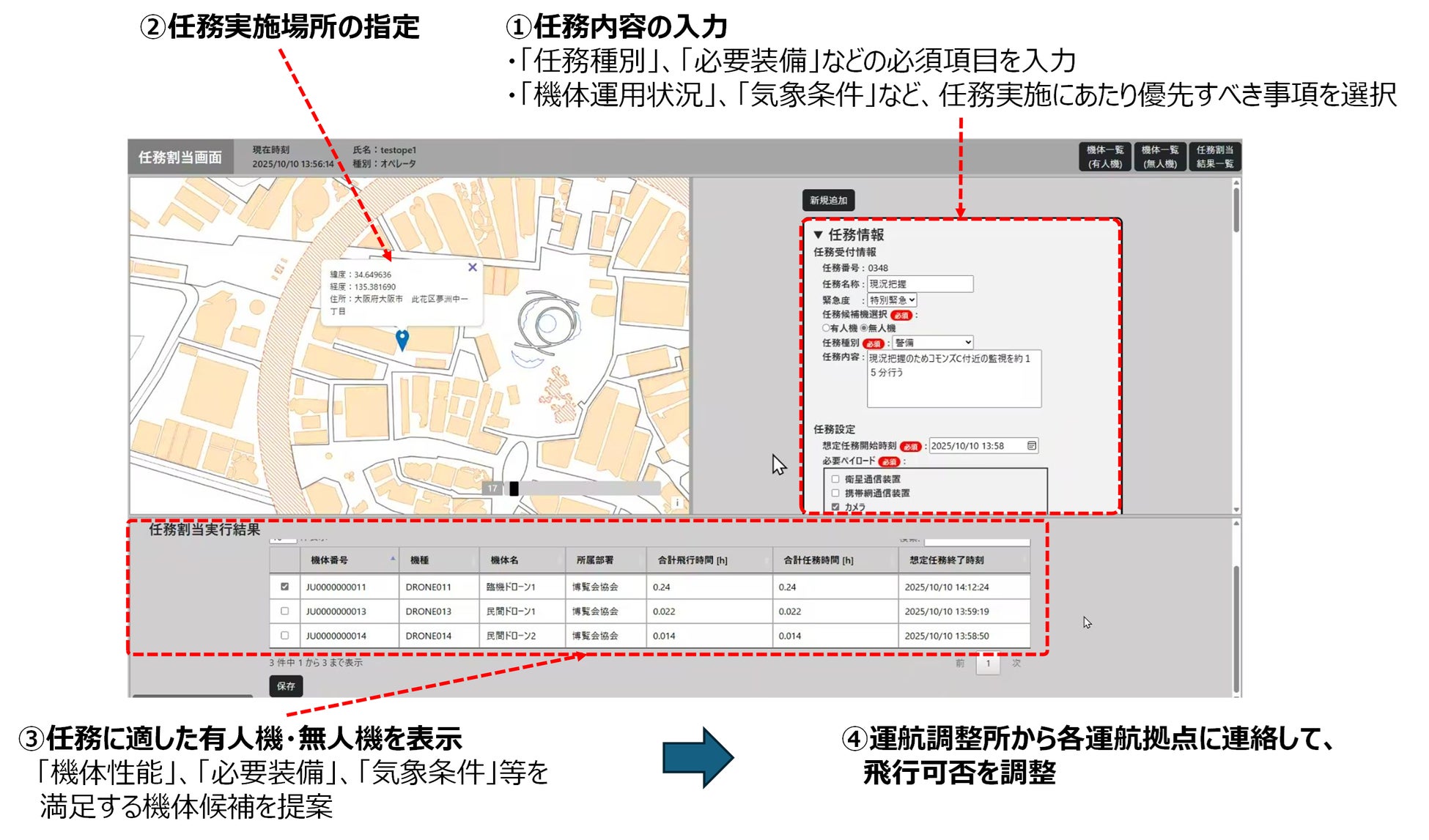 大阪・関西万博において、有人機・無人機による大規模イベントの警備を実施するという想定のもと、「運航調整所」が設置されたと仮定し、本システムを用いた「運航調整所業務」についての有効性を確認しました。評価にあたっては、省庁や自治体など、今後本システムの利用が想定される候補者が実施しました。