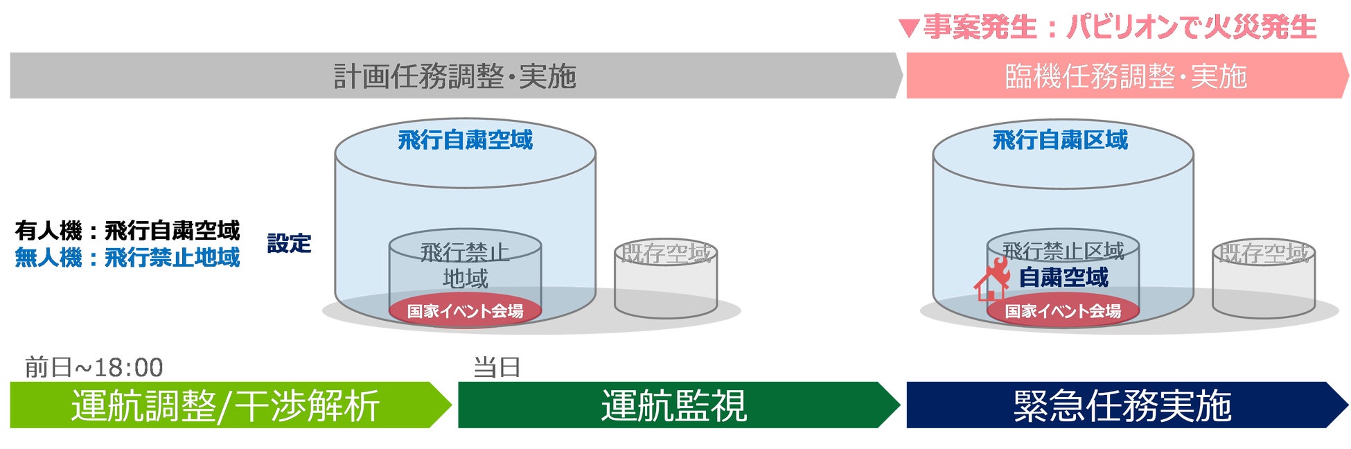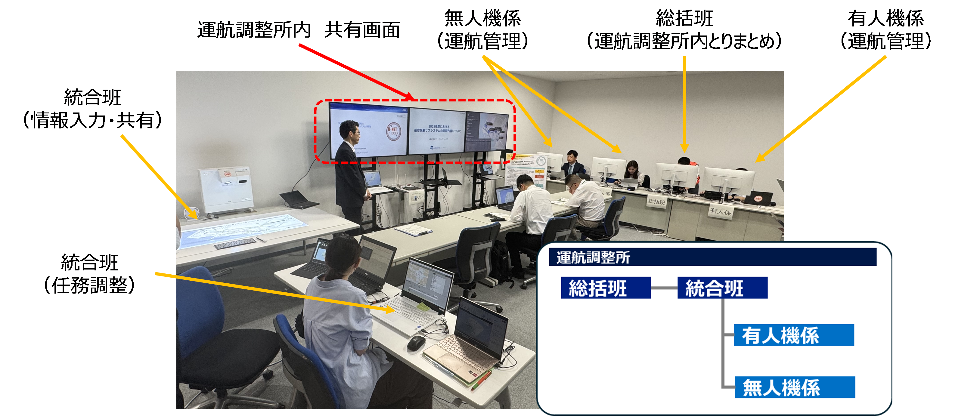 「運航調整所」では、有人機・無人機が飛行する前日の調整から、飛行当日の運航監視、当日に発生した緊急任務を有人機・無人機に割り当てる対応(任務割当)までを一連の流れとして想定し、これらの業務を対象とした実証シナリオを設定しました。(図1、図2)