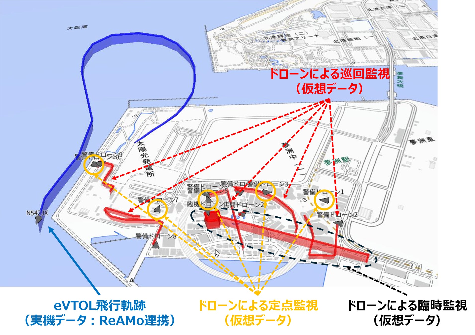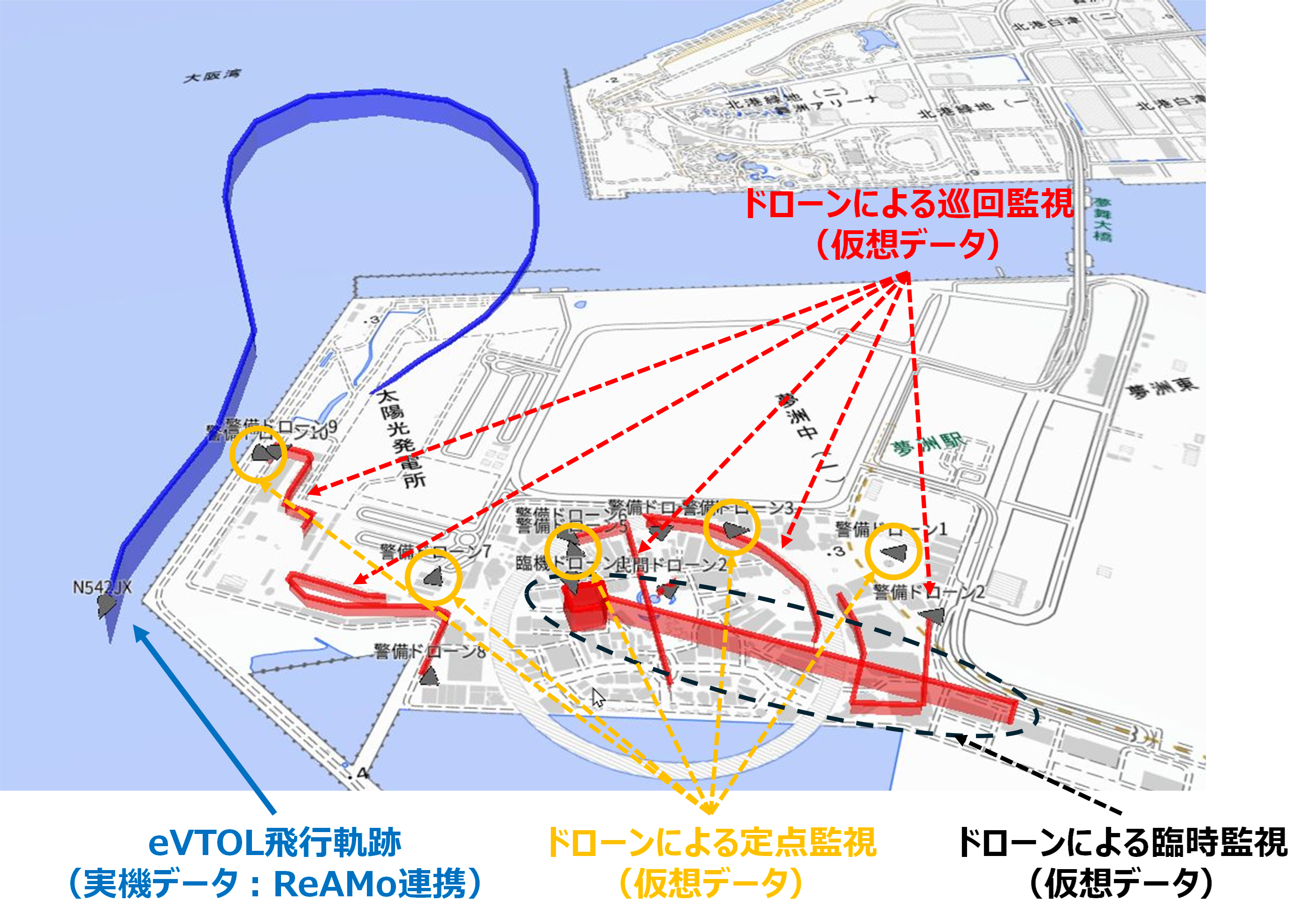本実証において、警備活動中に臨時に発生した緊急任務への対応は、実機への影響を考慮して仮想データを使用しました(図3)。また、次世代エアモビリティの社会実装に向けた実現プロジェクトである「ReAMoプロジェクト(※4)」と連携し、同万博で飛行した空飛ぶクルマ(eVTOL)の運航情報も共有できる体制を構築しました。(図4)