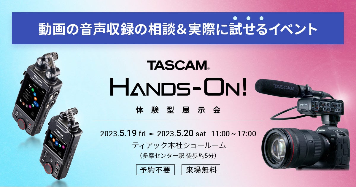 ティアック株式会社は、2023年5月19日(金)、20日(土)に東京都多摩市の本社ショールームにて、カメラメーカー各社と共同開発したミラーレスカメラ用XLRマイクアダプターや新製品の32bitフロート録音対応のポータブルオーディオレコーダーなど、動画の音声機材を試せるイベント『TASCAM Hands-On!』を開催します。