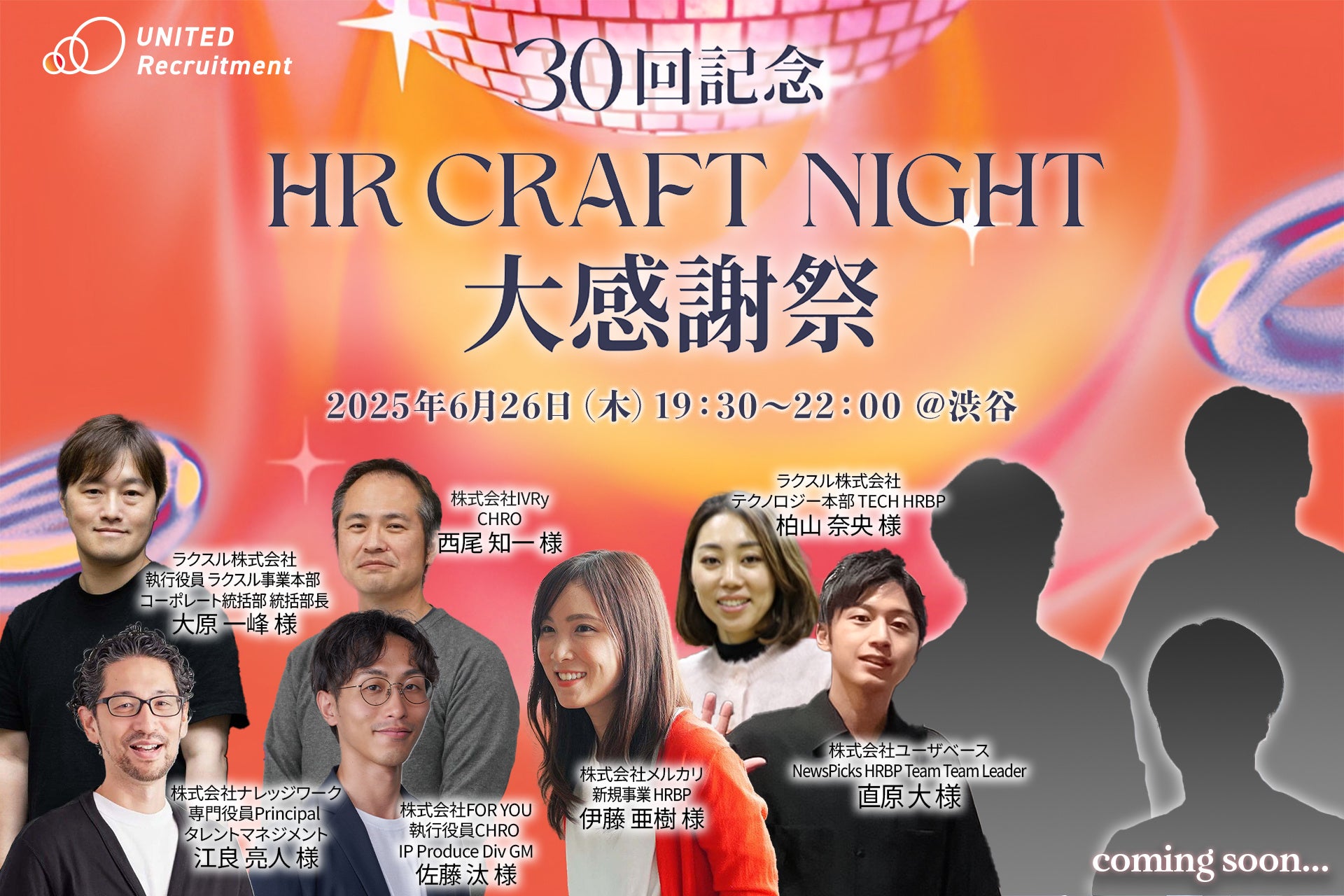 ユナイテッド株式会社(本社:東京都渋谷区、代表取締役社長 兼 執行役員:早川 与規、証券コード:2497)の連結子会社であるユナイテッド・リクルートメント株式会社(本社:東京都渋谷区、代表取締役:金子 陽三、以下「ユナイテッド・リクルートメント」)は、2025年6月26日(木)に渋谷で開催する企業人事向け交流イベント「HR Craft Night 30回記念 大感謝祭」において3部に渡り行うパネルセッションの第2部「セッション②現役HRBPパネルディスカッション」の登壇者が決定いたしました。