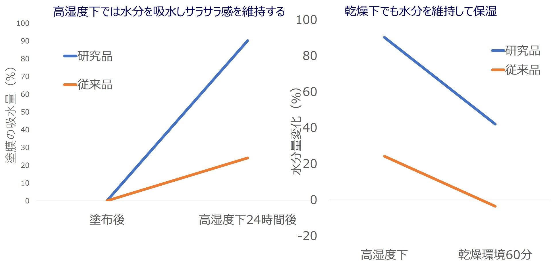 今回、新たに確認できたのは日焼止めの塗膜が環境に応じて快適な肌状態を保持する機能。塗膜を乾燥させ、高湿度下に置くと90%以上も水分を保持し、サラサラ感が持続します。さらに乾燥下では水分を長時間保持して保湿し続ける機能も持つことがわかりました。夏場のべたつきやクーラーによる乾燥など変化の大きい外部環境に対応できる処方であることが確認できました。