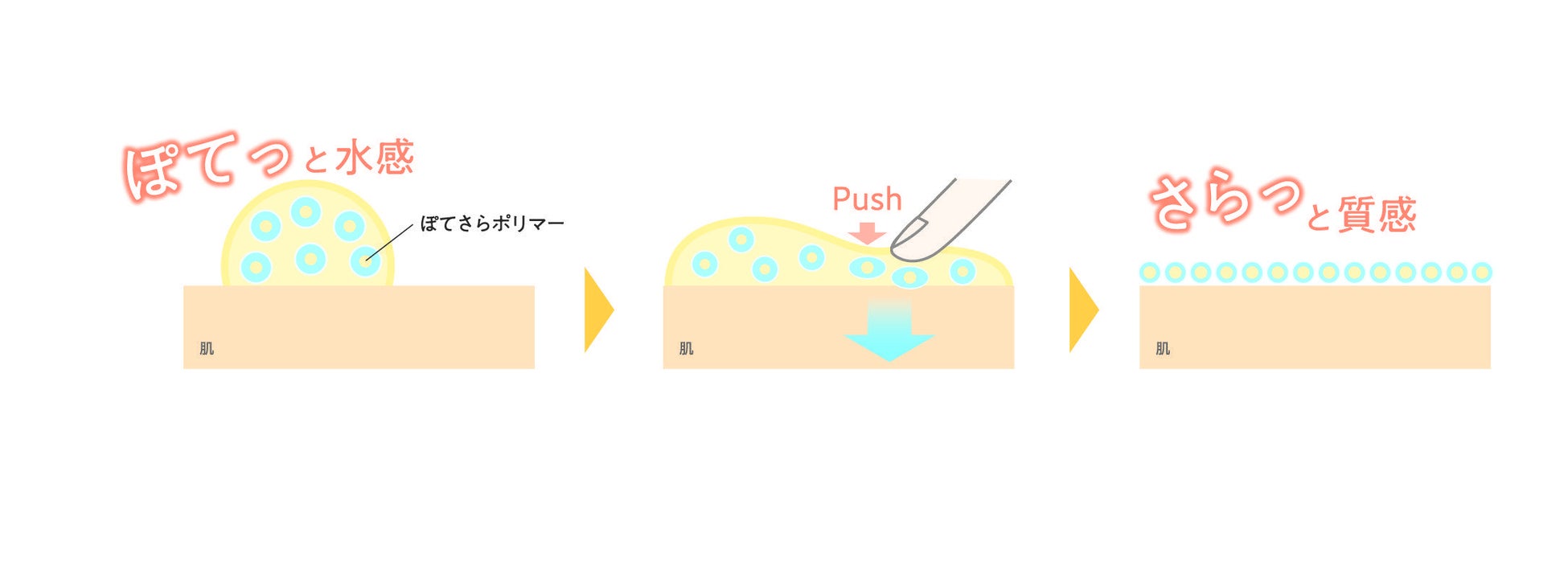 肌の上にのせたときは「ぽてっ」としたクリームが、伸ばすとスルスルと広がりパウダーに変化する使用感の日焼止め処方。「クリームタイプの日焼止めはべたつくのが当然」といった概念を覆し、塗ったことを忘れてしまうほどの軽いつけ心地でしっかりと肌を覆って密着します。サラサラ感が持続するため、塗り直しや塗り重ねも快適にできます。独特な使用感は、水分を抱えた「ぽてさらポリマー」を肌の上にのせたと時に感じる「ぽてっ」と、表面に残る「さらっ」とした質感が合わさることで生まれます。今まで両立することができなかった潤いとさらりとした心地よさの両方を実現した処方により、適度な塗膜を保ちながら厚塗り感なく、心地よく肌の上を覆いながら伸ばすことができます。このポリマー配合のアイデアは入社14年目の男性研究員によるもの。長くスキンケアや日焼止めの処方開発に携わる中でヒントにしたのは、おむつに入っている吸水ポリマー。高保湿環境下でも長時間肌をサラサラに保つテクスチャーは、男性社員の育児経験から生まれたものです。