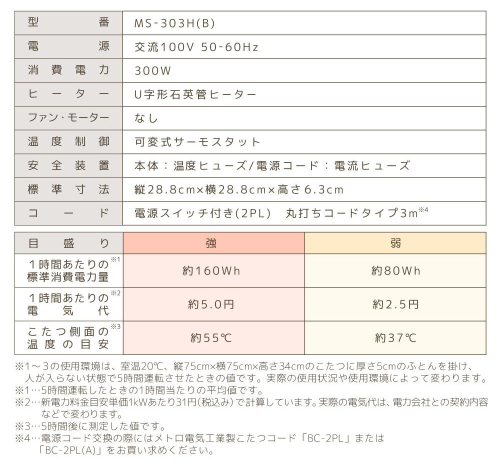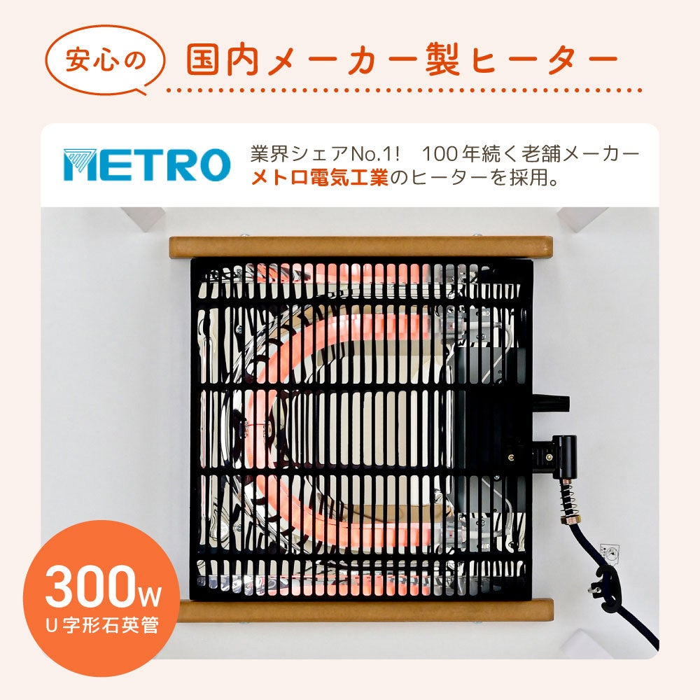 業界シェアNo.1(※)を誇るメトロ電気工業の石英管ヒーターを採用しております。発熱線からの遠赤外線で体を迅速に暖めます。さらに、消費電力の面からも、一般的なエアコン(消費電力600Whと改定)と比較した場合は電気代が約1/3以下に節約できる、省エネで経済的な製品となっております。