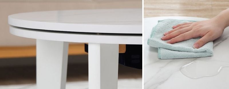 リビングテーブルとしても使用可能、おしゃれな大理石調の円形デザイン