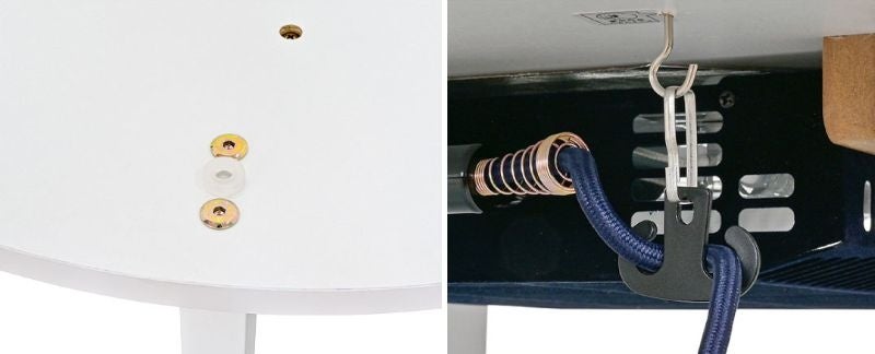 裏側には天板のずれを防ぐすべり止め付きで、オフシーズン時のリビングテーブルやローテーブルとしても安心して使えます。また、足元でコードが絡まないよう、コードフックも設置しており、安全・快適にこたつ時間を楽しめます。