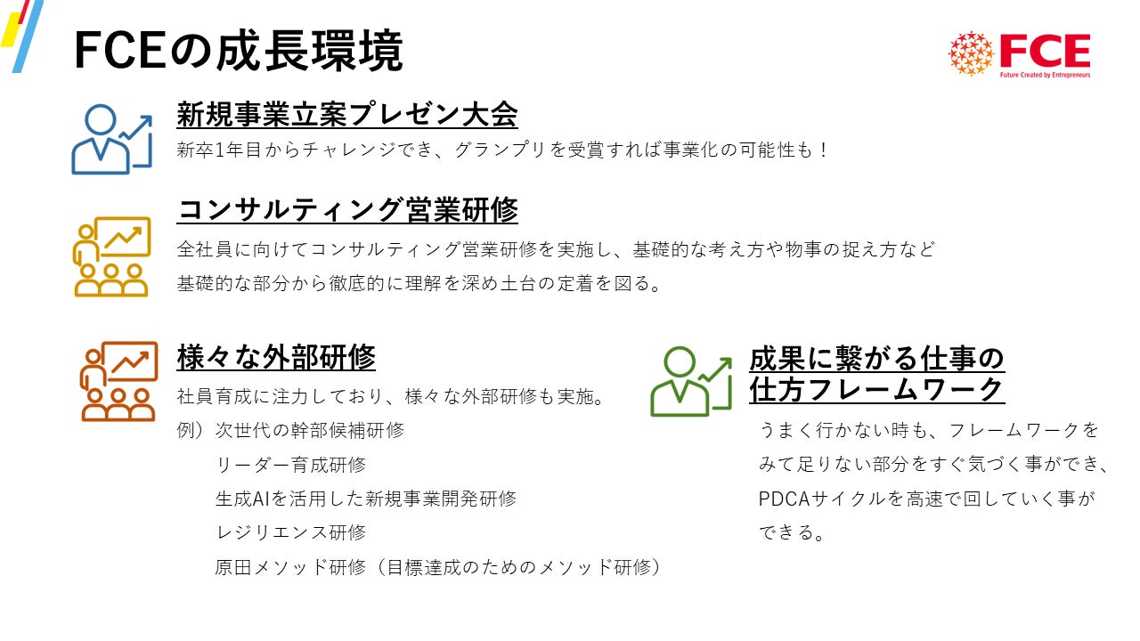 「入社前チャレンジ支援金」 以外にも安心して入社準備ができる「内定者フォロープログラム」の充実や入社後コンサルタントとして成長できる環境づくり・人財育成に力をいれています。加えて2025年12月より就活生のチャレンジを応援する性格・適職診断ツール「FCE式キャリンク診断」提供開始し、心理学と統計学を組み合わせた「自己診断」×「他己診断」で多角的な自己分析を支援しています。