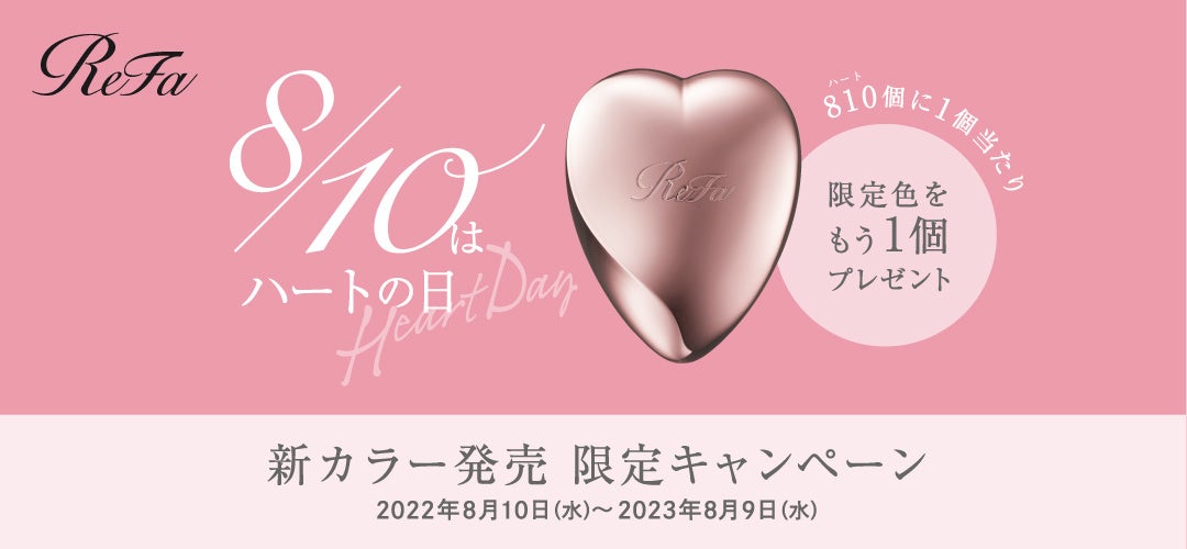 2022年8月10日(水)から2023年8月9日(水)までの1年間、810個に1個の確率でReFa HEART BRUSHに当たりくじを同梱。当たりくじと引き換えで、限定カラーのReFa HEART BRUSHを1個プレゼントいたします。