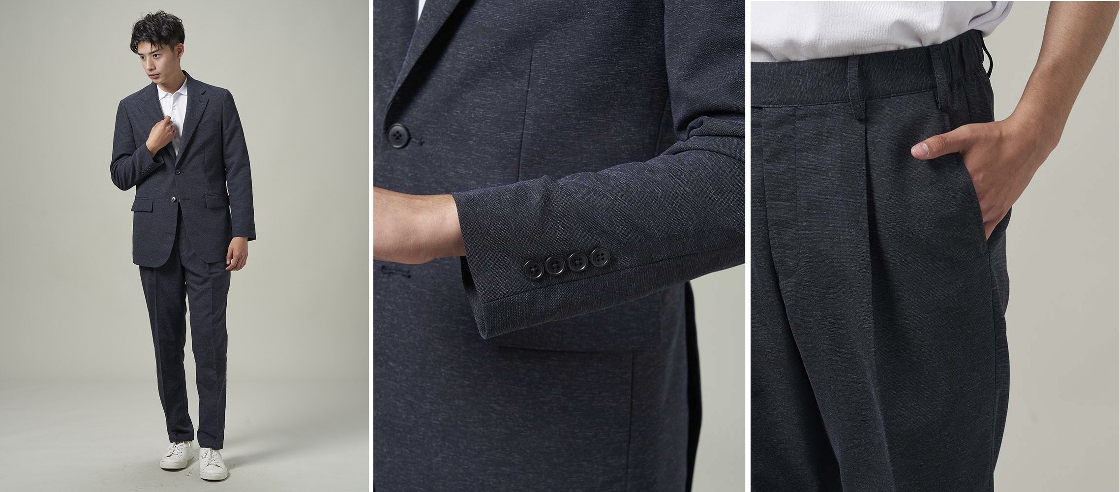 夏シーズンにオススメのセットアップアイテムです。軽量&高ストレッチでストレスフリーな着心地、高通気で涼しい着用感の夏向け仕様のジャケットとパンツの展開。先染めカラミ素材を使用しており、上品な印象を演出します。ジャケットは、3つ釦段返りのスリムなデザインで、スタイリッシュなシルエットが叶い、肩パットが無く、軽量でありながら、タレ綿仕様になっているため、自然なラインを演出できます。パンツはウエストシャーリング仕様でお腹周りがリラックスした履き心地となっております。上下ともウォッシャブル仕様で、ご自宅でお洗濯が可能で手入れ簡単なアイテムとなっております。