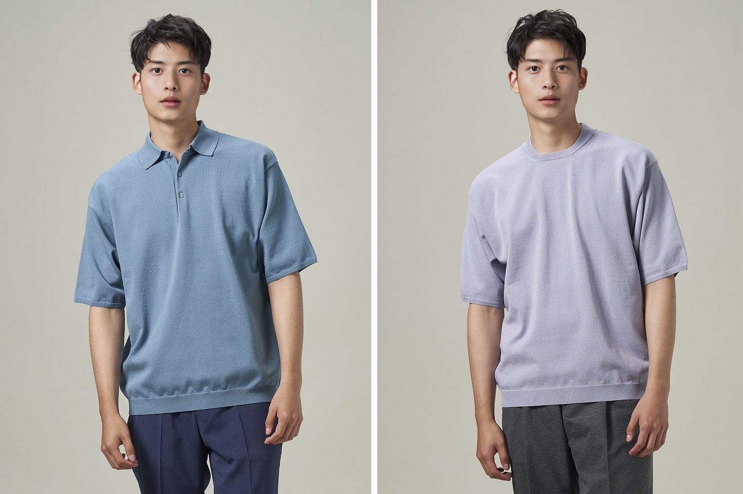 ニットポロシャツはカジュアルになりすぎないよう、編地切り替え部分をミラノリブにし、首に沿い高さがありドレス感をキープしたデザインになっています。ニットTシャツは、ジャケットインに着やすい後ろ衿高デザインを採用しています。