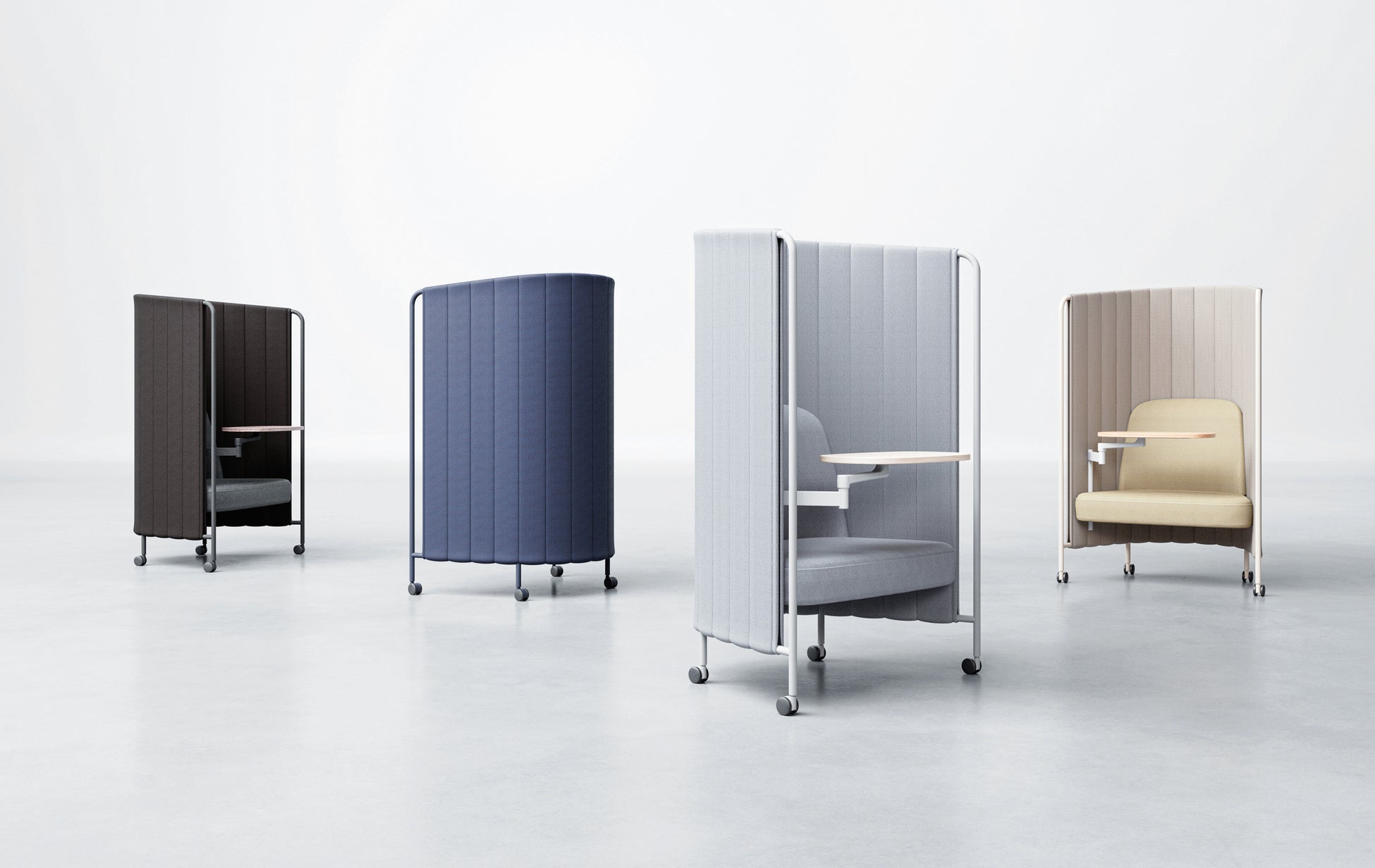 周囲の視線を遮るバックパネルと気軽に移動できる機動性を備えたテーブル付ソファです。複数並べた際、単体で使えばフォーカスワークに適しており、向かい合わせればコミュニケーションスペースに替わります。