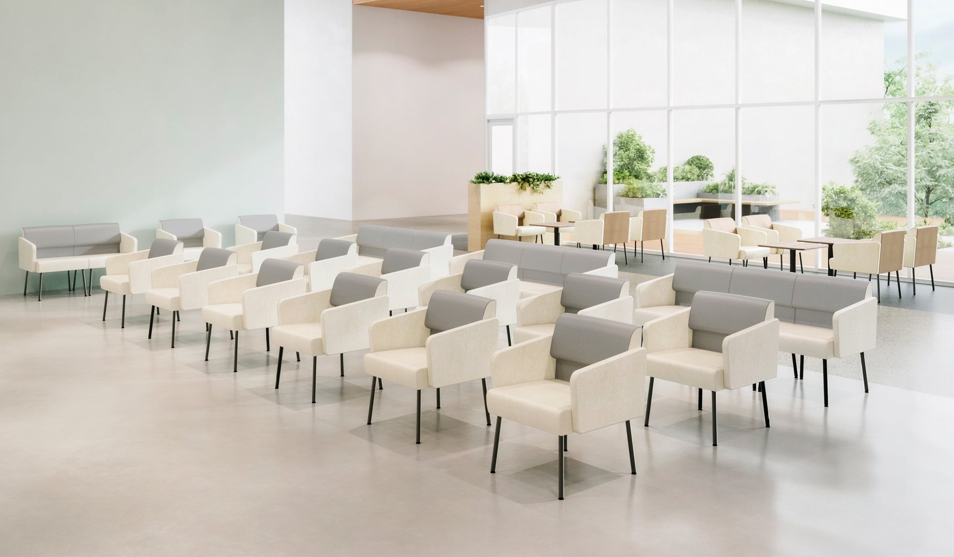 軽快な意匠でありながら落ち着ける座り心地を持っており、一人掛けサイズなので用途に応じて自由に組み合わせることができます。非常時も安全に考慮して自在にレイアウトできるフェーズフリーなロビーチェアです。