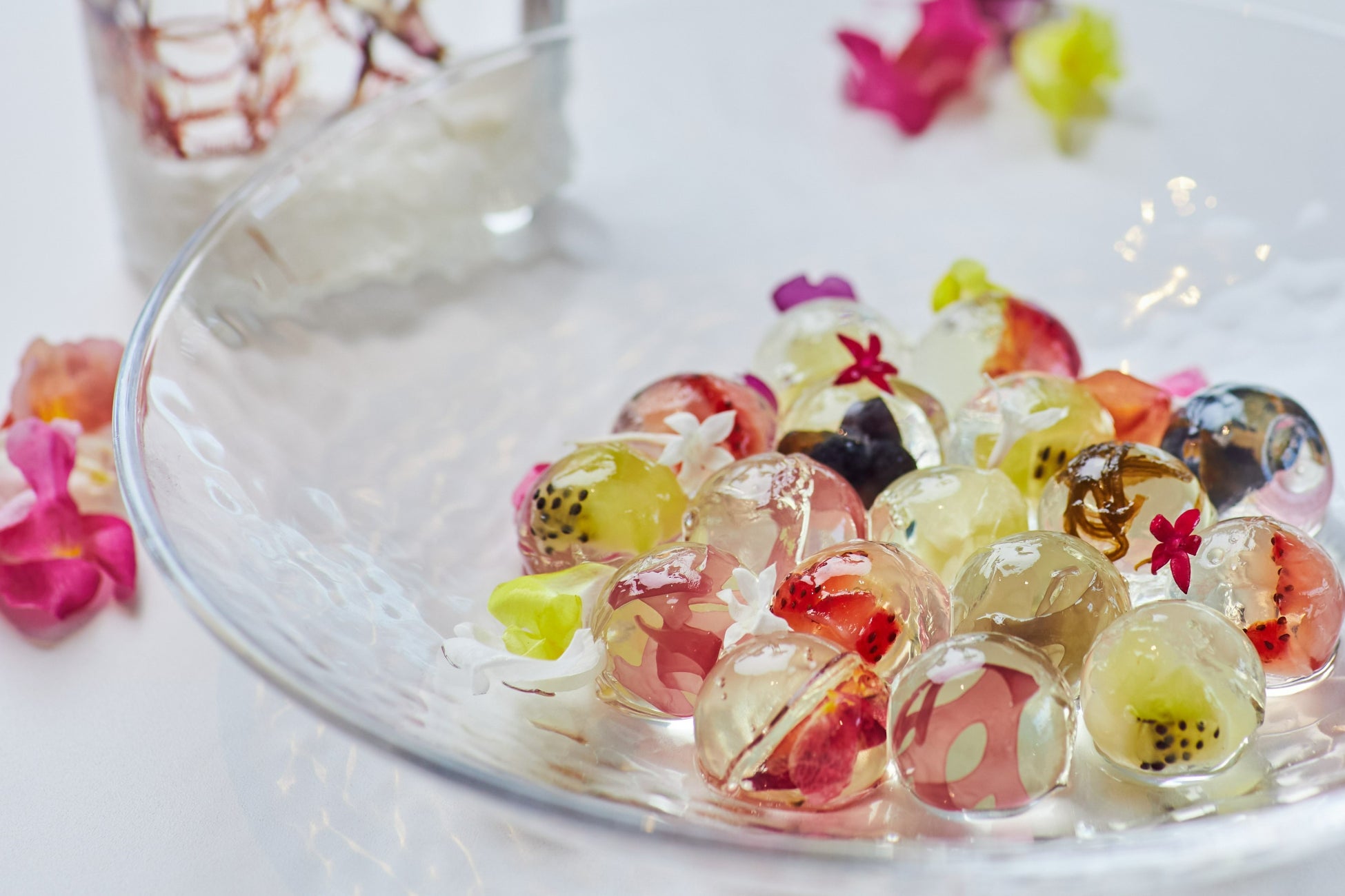 海藻の一種であるテングサで作った一口サイズの「海の花ゼリー」が登場します。ゼリーの中は、フルーツやエディブルフラワー(*5)、コリコリとした食感が特徴の海藻「ツノマタ」などを使用。海藻の食感だけでなくフルーツの爽やかな味わいや、華やかな見た目からも春を感じることができる一品です。