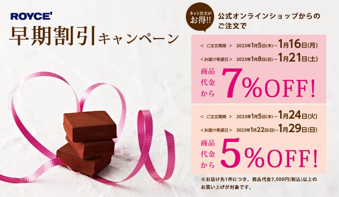 バレンタインデー時期よりもお早めのご注文・お届けでお得になるキャンペーンを開催中。ぜひご利用ください。