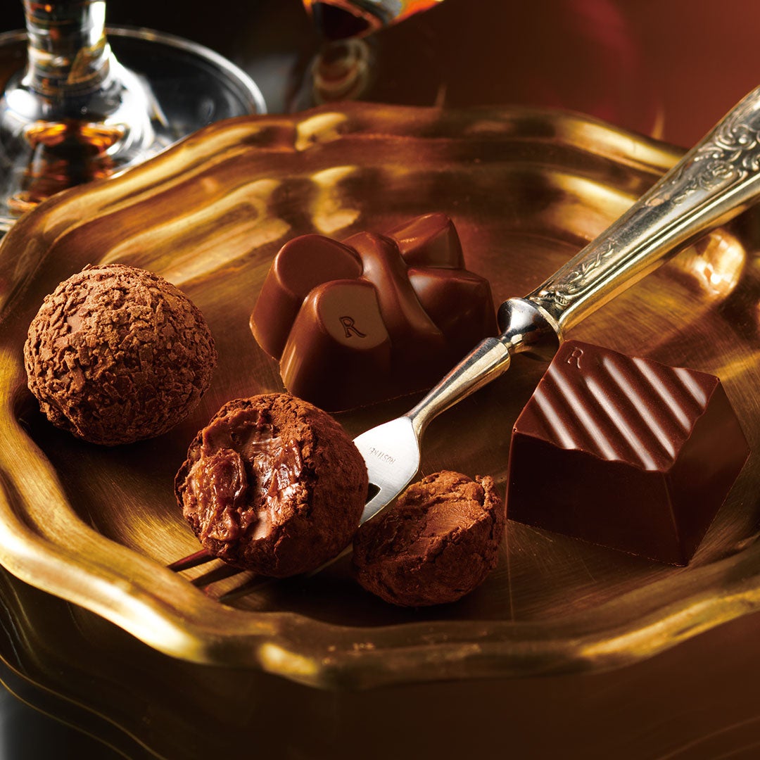 コニャック、ラム酒、グラッパ、アイラウイスキー。4種の名酒を使用したプラリネショコラ。世界の名酒を贅沢に使用し、ひと口食べた瞬間から洋酒の香りを感じていただけるように仕上げました。まるでお酒のテイスティングをするかのようにお愉しみいただける一品です。