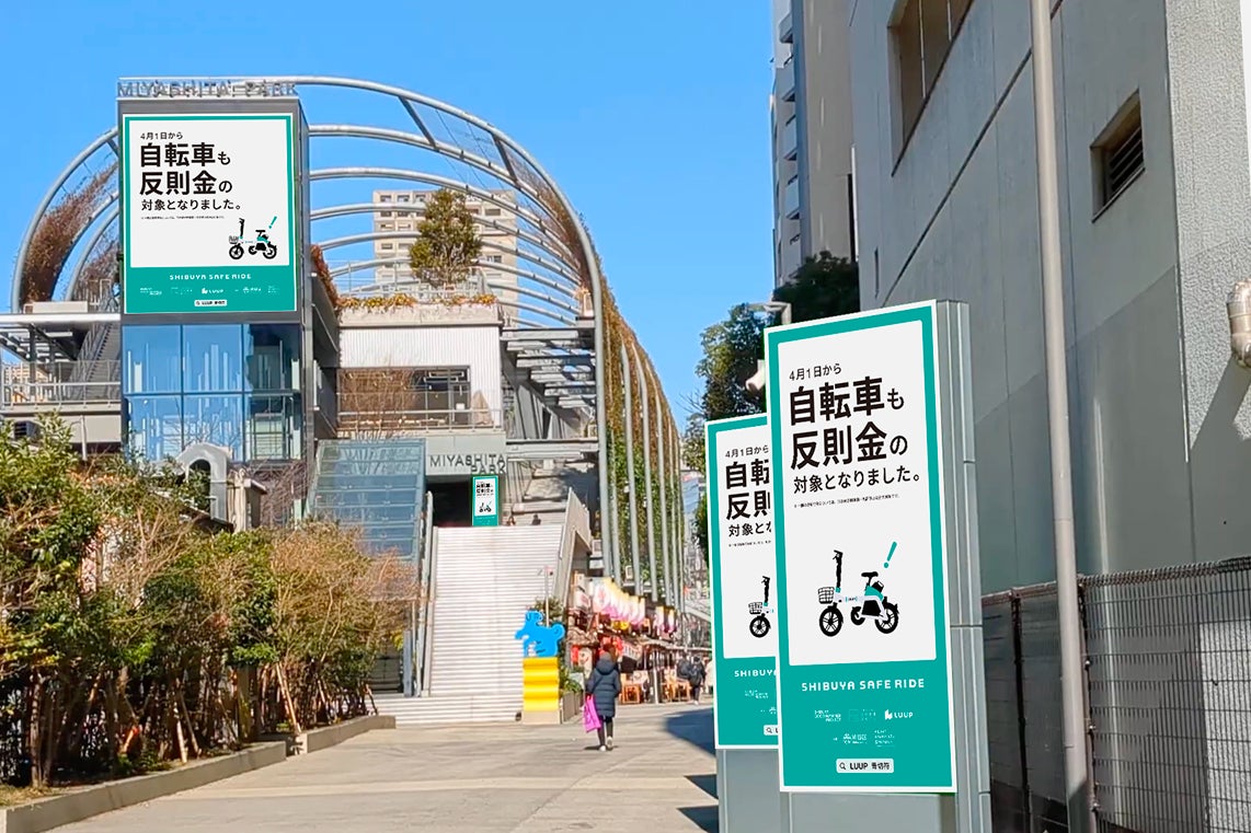 自転車への「青切符」制度導入に関する啓発クリエイティブを掲出します。また、MIYASHITA PARK(東京都渋谷区神宮前6-20-10)4階では、4月1日(水)〜15日(水)にLUUPの電動アシスト自転車の展示も行います。