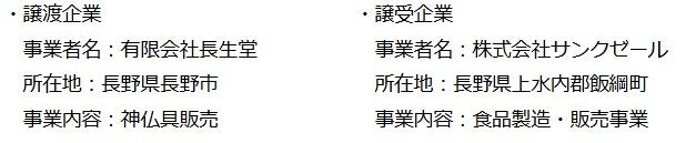 M&A・事業承継支援プラットフォーム「BATONZ(バトンズ)」を運営する株式会社バトンズ(本社:東京都中央区、代表取締役CEO:神瀬悠一、以下バトンズ)は、長野信用金庫(本店:長野県長野市、理事長:鈴木弘一)とともに、有限会社長生堂(所在地:長野県長野市)と久世福商店などを運営する株式会社サンクゼール(所在地:長野県上水内郡飯綱町)のM&Aの支援をおこないました。