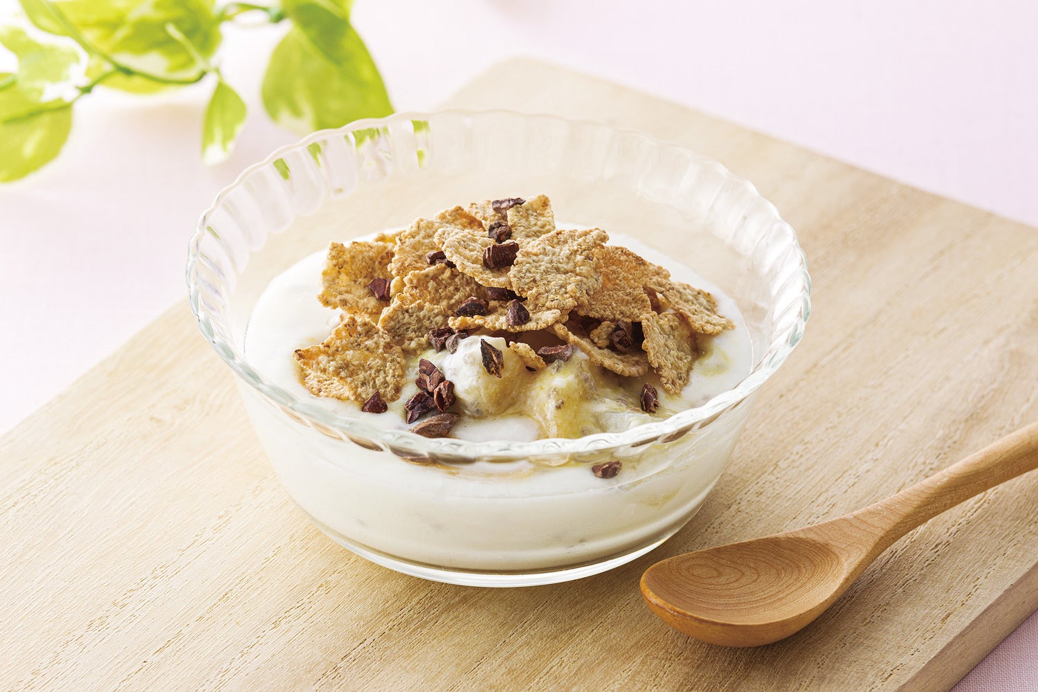 チアシード、桃、マンゴーピューレ、ナタデココの入ったヨーグルトに玄米シリアルとカカオニブをトッピングしました。