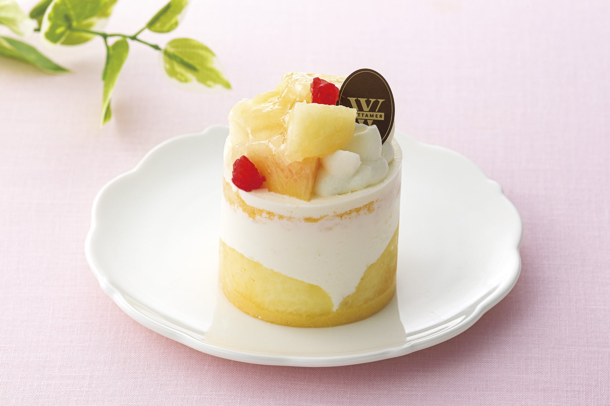 豊かなコクと旨みのあるなめらかなクリームとスポンジで福島県産の桃をサンド。みずみずしい桃とフランボワーズを飾りました。