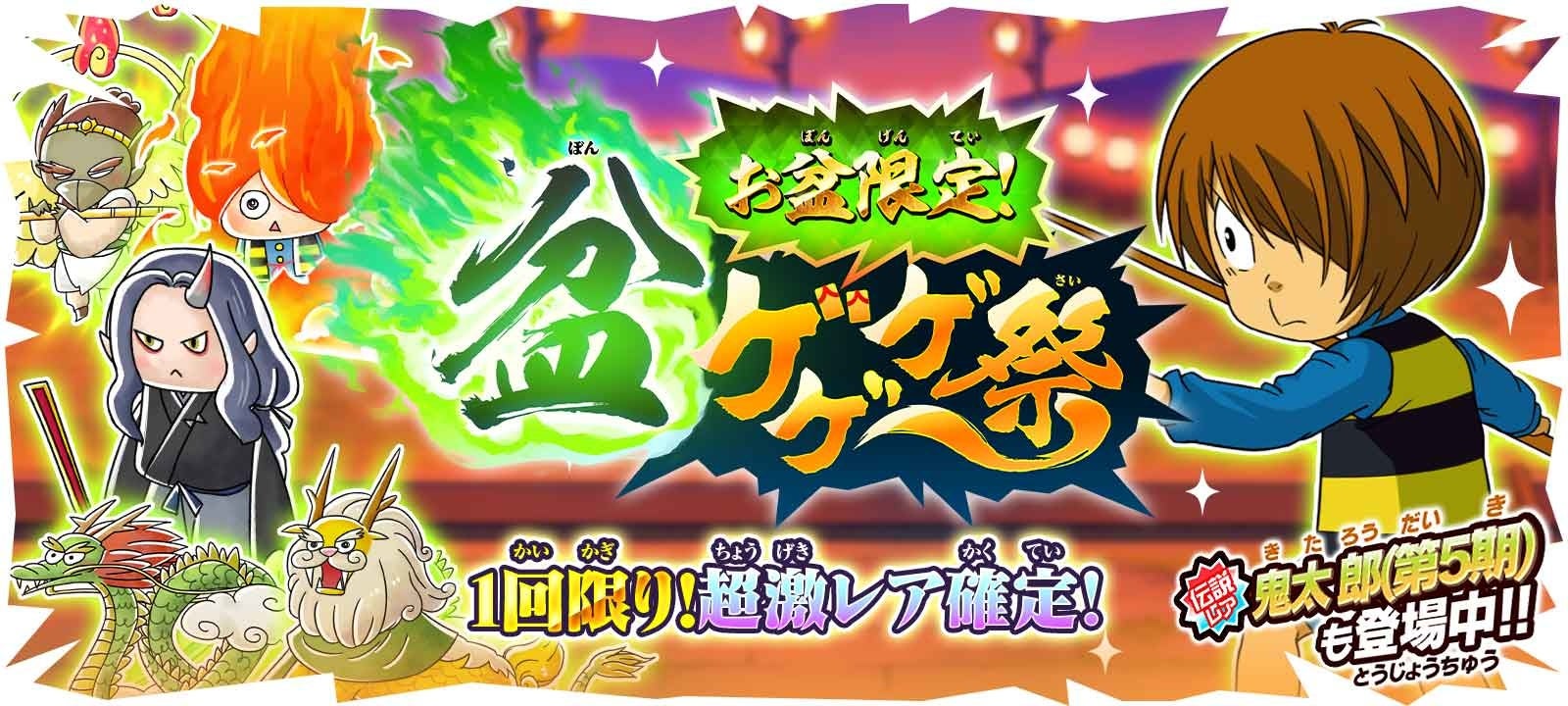 ゆるゲ大戦争製作委員会(配信・企画:東映アニメーション株式会社、企画・開発・運営:ポノス株式会社)は、人気アニメ『ゲゲゲの鬼太郎』を題材としたスマートフォン向けゲーム『ゆる~いゲゲゲの鬼太郎 妖怪ドタバタ大戦争』(略称:ゆるゲゲ)におきまして、10回ガチャ1回限定で超激レアが必ず登場する「盆ゲゲゲ祭」および、「超ゲゲゲ祭」の開催をお知らせいたします。
